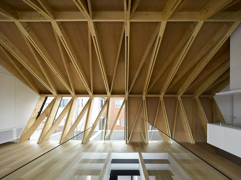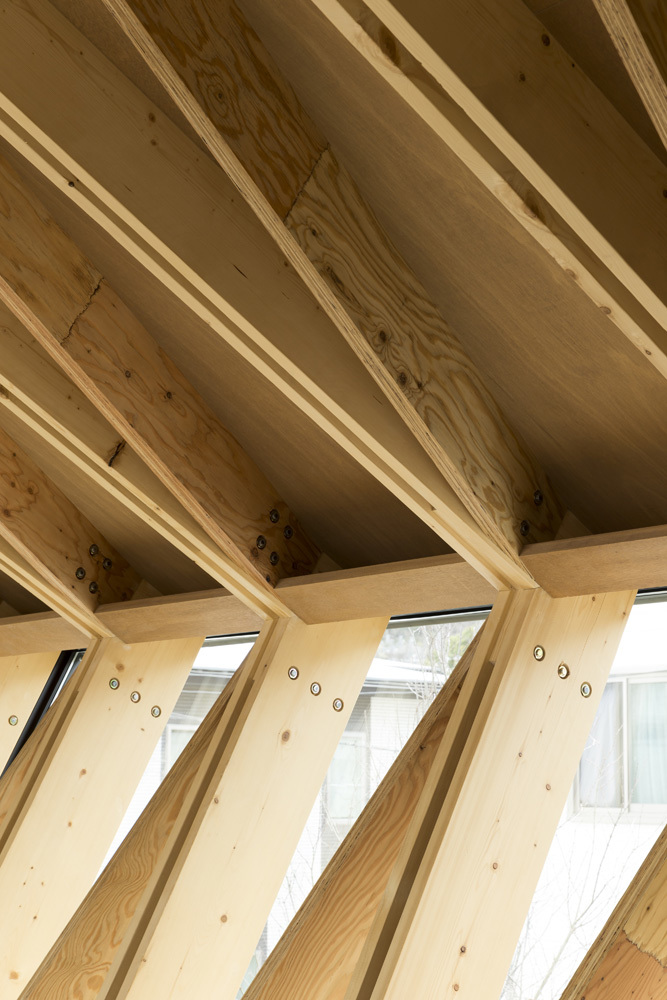 階段を上がると2階の壁と天井を一体化する構造体が徐々に姿を現す。連続的に組み上げられた三角構面はSPFとLVLの組み合わせで構成され、床からスリークッションで軒先まで繋がるシェル空間の内部には柱が存在しない。また、開口部は木製4枚引戸とし、バルコニー手摺を透明強化ガラスを用いて高い開放性をつくりあげた。妻側の家具内にキッチンやリビングの諸機能が収納され、色を白にすることで構造体とのコントラストをつくり出している。