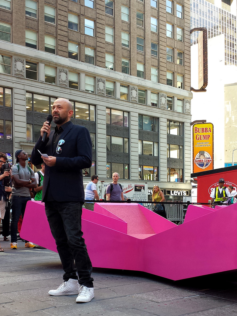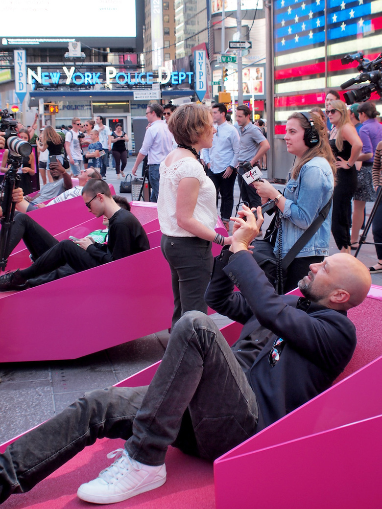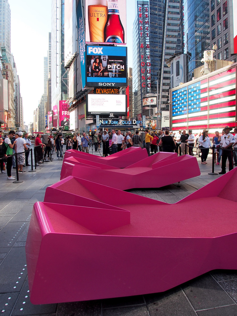 German architect J. Mayer H. unveiled his new installation, XXX TIMES SQUARE WITH LOVE, in New York City's Times Square this morning. The pink seats reference the X-shaped street inersection of Broadway and Seventh Avenue as well as the adult theaters that once populated the area.