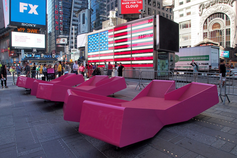 J. Mayer H.'s three Xs, which can accommodate four people each, sit between 43rd and 44th Streets on a completed section of the plaza designed by Snøhetta. The pink color contrasts sharply with the dark paving of the paving, though it is right at home in the brighy cacophony that is Times Square. Although a relatively small project for Jürgen Mayer H., it is an important one since it brings the Cooper Union-trained architect back to the city where he studied.