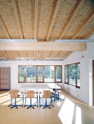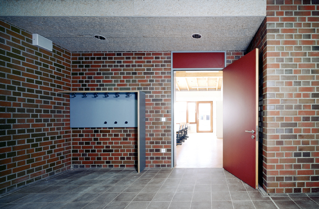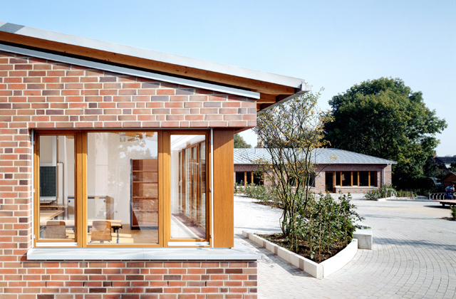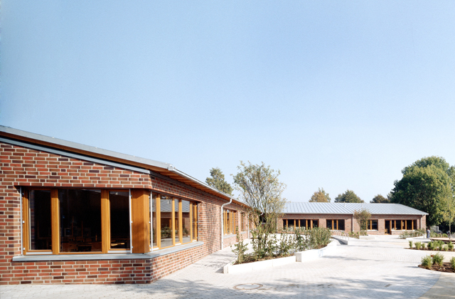 Der Erweiterungsbau besteht aus einem Klassentrakt mit 7 Klassen- und Gruppenräumen, drei Pflegeeinheiten sowie aus einem Sportbereich mit Einfeldturnhalle und Lehrschwimmbecken. Das bestehende Schulgebäude wurde in den Nutzungen optimiert und umgebaut. Der Hauptzugang ist in das Zentrum des neu entstandenen Ensembles verlegt worden. Von diesem zentralen Punkt sind sowohl der Bestand als auch der Neubaubereich über einen als Rückgrat ausgebildeten Verbindungsgang zu erreichen. Der Geländetopographie wurde in Form von Rampen im Innen- und Außenbereich entsprochen. Klassen- und Gruppenräume orientieren sich zu den baumbestandenen Freibereichen. Ziegelmauerwerk und Zinkdächer nehmen die Materialien des Bestandes auf. Das Ministerium für Schule und Weiterbildung NRW hat in Zusammenarbeit mit der Architektenkammer NRW für dieses Objekt den Schulbaupreis verliehen.