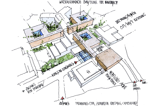 Die heterogene Struktur des bestehenden 545-Betten-Krankenhauses, mit der Durchmischung von Pflege- und Behandlungsbereichen, unübersichtlichen Wegeführungen sowie seiner in Teilen sanierungsbedürftigen Bausubstanz, soll schrittweise ersetzt und entwickelt werden. Das Lösungskonzept umfasste unter anderem die Verlagerung der Notaufnahme und deren Zufahrt, so dass die wichtige Trennung der Verkehre für die Besucher und Liegendkranke hergestellt wird und die Neustrukturierung der Patientenaufnahme, mit der Trennung der elektiven Patienten zu den Notfallpatienten. Es entsteht ein zusammengefasster, konzentrierter Bereich für die Not- und die Patientenaufnahme. Die etablierte Lage des Haupteinganges bleibt erhalten. Eine neue Halle mit dem zentralen Empfang bildet ein zeitgemäßes Entree. Des Weiteren wird eine Magistrale ausgebildet, welche das Krankenhaus in einen Untersuchungs- und Behandlungstrakt und einen Pflegebereich gliedert.