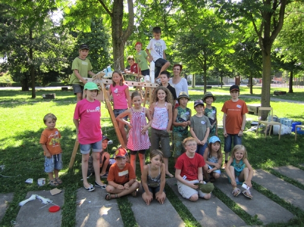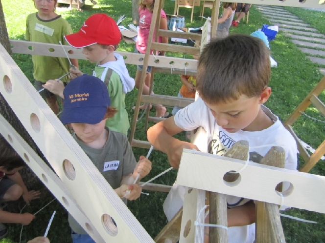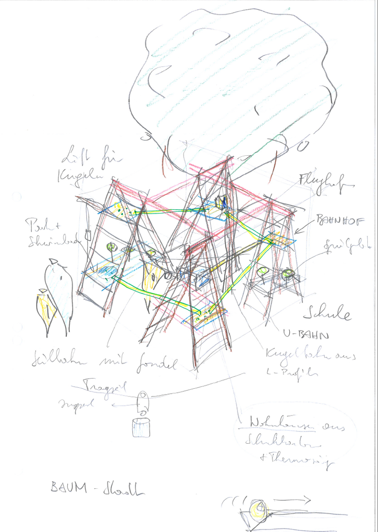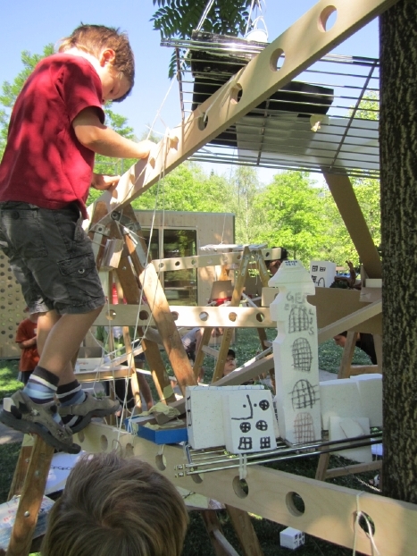 Wir tauchen gemeinsam mit 20 Kindern ein in eine neue Welt, in einen neuen Maßstab, in dem alles möglich ist und wird. Wir bauen nicht nur ein Baumhaus, sondern wir bauen sogar eine ganze Baumstadt. Wir bauen zuerst eine Grundstruktur aus Leitern und Holzlatten im Schatten eines Baumes. In dieser Grundstruktur entstehen auf vielen Ebenen alle von den Kindern erdachten und gewünschten Teile einer Stadt. Verbunden wird alles untereinander mit Wegen aus Kugelbahnen, Rohren, Liften und Seilbahnen.