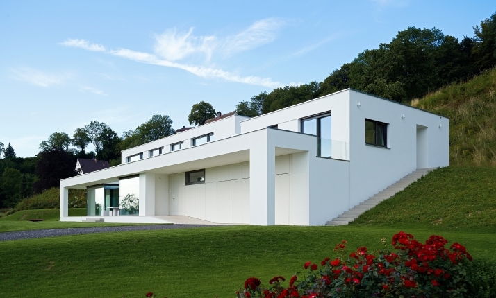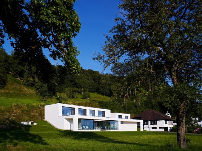 Ein längsgerichteter Baukörper wird parallel zu den Höhenschichtlinien in den Hang gesetzt und orientiert sich mit seiner Hauptfront nach Westen zum Bodensee. Das Obergeschoß ist zurückversetzt. Der zweigeschossige Baukörper treppt sich somit parallel zum Hang ab.