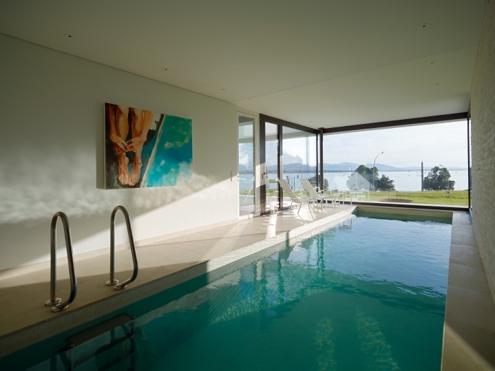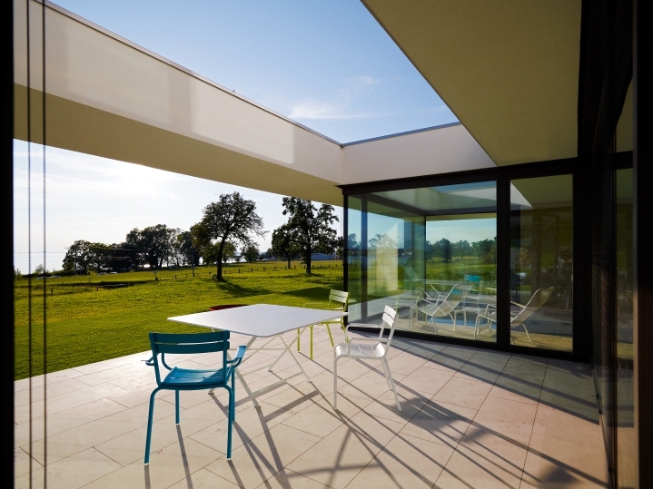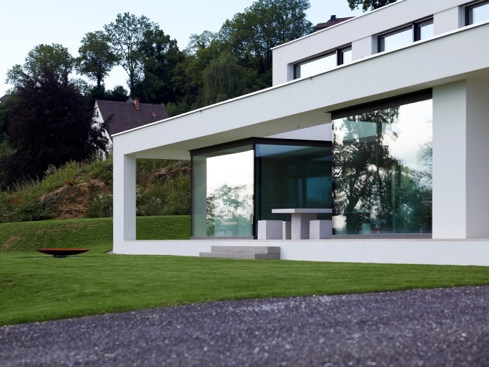 Die Zufahrt erfolgt über den bestehenden Weg an der Südseite des Grundstücks. Am Ende der Zufahrt ist eine Garage im Baukörper situiert. Über eine gedeckte Rampe wird das Erdgeschoß erschlossen. Im Erdgeschoss sind um einen Hof Küche, Ess- und Wohnraum, Schwimmbad und Sauna situiert. Den gesamten Baukörper in seiner Hauptorientierung umfasst ein weit gespanntes Band mit einer Terrasse, Innenraum und Außenraum gehen ineinander über. Raumhohe Glaselemente formen ein Tageslicht durchflutetes, möglichst transparentes Raumkontinuum.