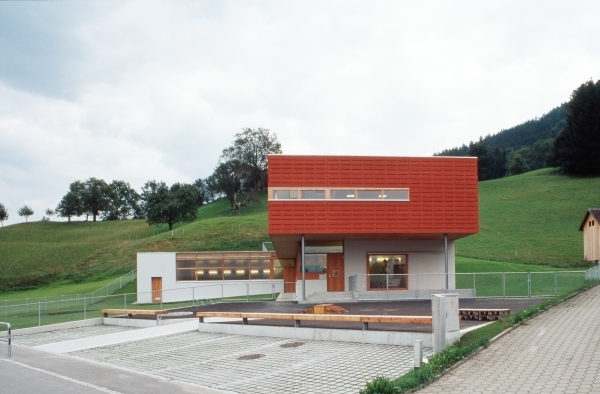 Das massive Hineindrängen der Baukörper in den Hang gleicht das Defizit an ebenen Flächen im Grundstück aus und schafft Platz für die Freibereiche – einen öffentlich zugänglichen Spielplatz vor dem auch extern genutzten Seitentrakt, einen privaten Spielhof für den Kindergarten im südseitigen Gelände und einen asphaltierten Vorplatz mit Skaterrampen und Sitzbänken, die eine Barriere zum tieferliegenden Parkplatz bilden.