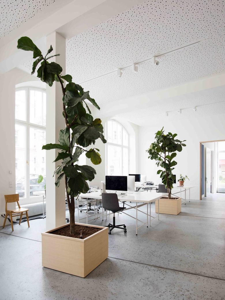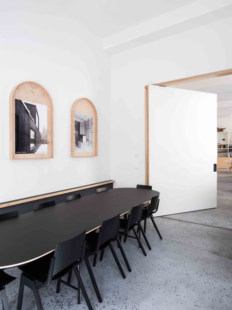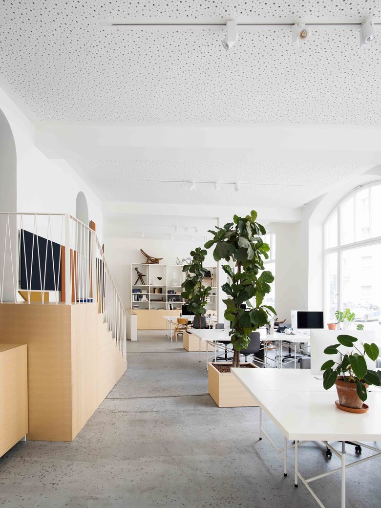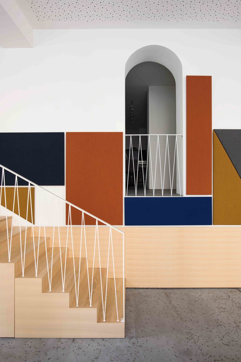The offices of Arnold / Werner are located at Isabellastrasse 13, a listed art nouveau building dating from 1906 on the border between Munich’s Maxvorstadt and Schwabing districts. The office areas include around 20 workstations spread across 250 m2 on the ground, mezzanine and basement floors. The smoothed, stone floor is complemented by wooden fixtures made of natural ash along with Kvadrat soft cell acoustic panels. This is all rounded off by the AW Café. The company’s very own coffee bar is open to the public each morning from 8–10 am, and is then used by employees and company clients.