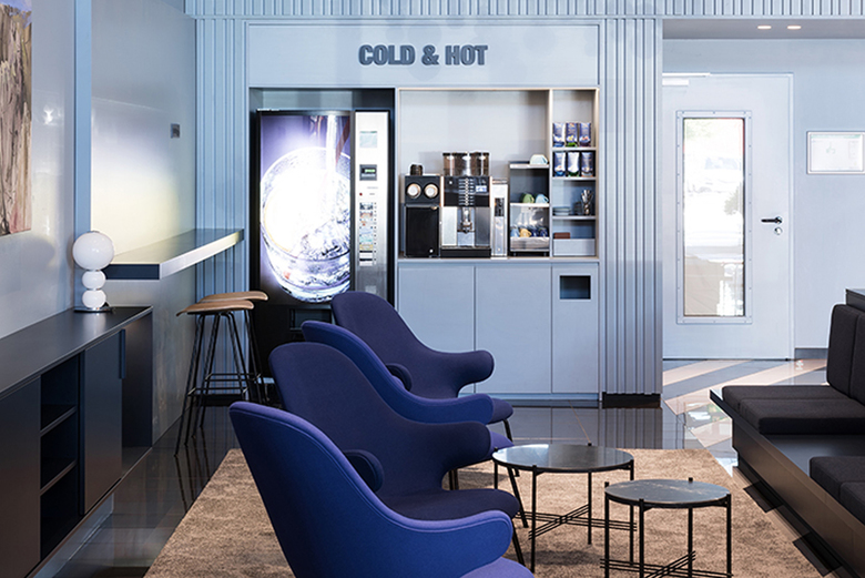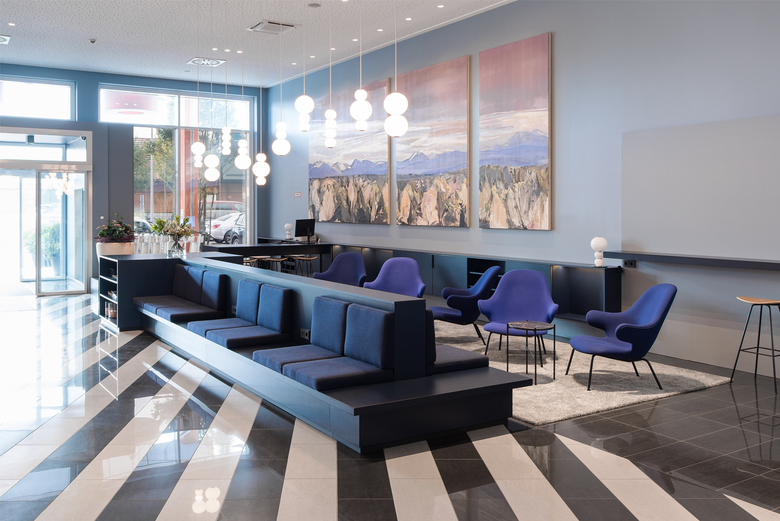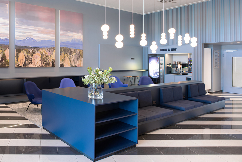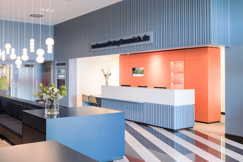 Neun Jahre nach Eröffnung des Hotels Stay2Munich in Brunnthal bei München übernahm Arnold / Werner gemeinsam mit laborette Raumgestaltung die Erneuerung der Lobby und des angrenzenden Bürobereichs. Ein mittig platziertes Sitzmöbelelement mit Ablagefächern, Steckdosen, USB-Anschlüssen und Lodenstoff-Polsterauflagen definiert einen Warte- und Aufenthaltsbereich, der den gesamten Raum gliedert. Die blaugrauen Holzbekleidungen an der Rezeption und Rückwand rahmen eine Getränke- und eine Infostation sowie den Zugang zu den Zimmern und verbessern zugleich die Raumakustik. Sämtliche Arbeiten wurden mithilfe eines Gerüsttunnels in zwei Bauphasen im laufenden Betrieb durchgeführt.