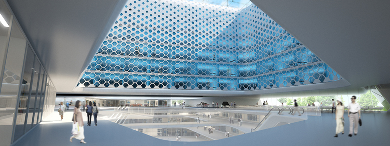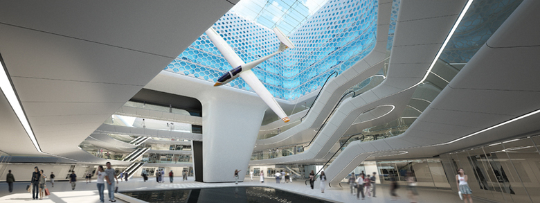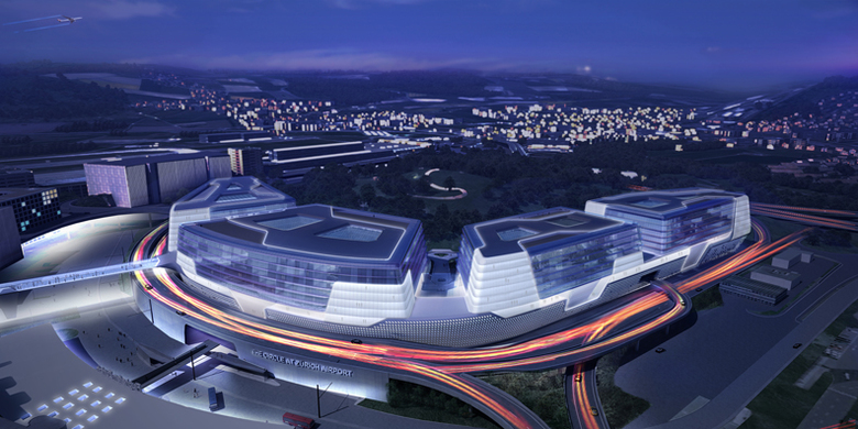 AirSpace is designed to accommodate a highly dynamic set of programs housed within a bold and coherent architectural statement that responds to both the uniqueness of its program as well as its important location at Zurich Airport. The towers’ massing and articulation provide a scale that is tailored to the diverse identities of flight, transience, technological elegance and engineered functionalism, all key aspects of a brand such as Zurich Airport. The conceptual underpinning of AirSpace is the creation of an ‘activated’ urban experience located on the third level of the project, articulated as a public realm situated between the plinth and the towers. Acting as a spatial break between these two elements, this is an important public event space that connects the horizontal levels of the programmed space with the ambitious and open verticality of the atriums above. Asymptote’s design for AirSpace is a contemporary architectural solution that anticipates the evolution of the roles that airports play, serving not only as transportation hubs but as important urban environments utilizing the energy and action of flight, internationalism and glamour – in effect, addendums to significant and energetic spaces of the city.