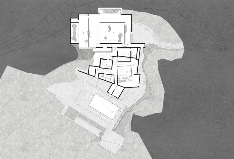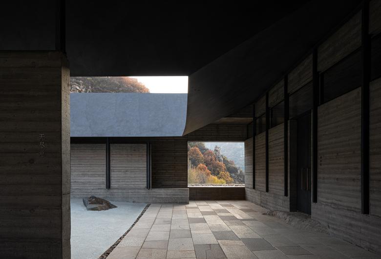 The entrance is arranged around an open stone courtyard, with a Buddhist hall for statues on one side. The courtyard conveys the spatial atmosphere of the traditional corridor courtyard with the thin steel plates hanging inward and the thin steel columns attached to the concrete enclosure wall. The upward opening of the open courtyard frames a view towards the sky. On the other hand, the horizontal opening facing the valley on the west side precisely frames the Great Wall and a natural stone statue. The Buddhist hall is named "Omniscience Hall", meaning to free oneself from troubles with the wisdom of universal knowledge.