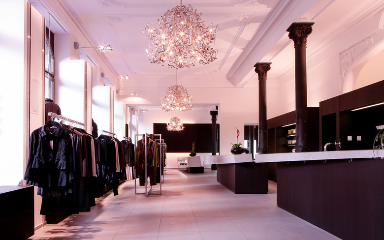 Das Aerni verbindet Boutique, Coiffeur, Spa und Café in historisch wertvollen Jugendstil-Räumlichkeiten. Mit der Gestaltung wurde der historische Bestand hervorgehoben, die Technik feinfühlig und scheinbar unsichtbar integriert. Verbindendes Element im gesamten Raumgefüge sind die schräggestellten Betonkuben, die als Verkaufstheke, Display und als Übergang zum Café-Bereich dienen, wo sie zur Bar werden. Im Café greift die ornamentale Tapete die Stuckaturen des Raumes auf. Die Kleidungsstücke werden in der Boutique auf zurückhaltenden Trägern präsentiert, um den Fokus auf das Produkt zu lenken. Der Coiffeur-Bereich ist gleichmässig ausgeleuchtet, mit Ausnahme des Haarwaschbereichs in einer eingeschobenen Holzbox, der bewusst mit reduzierter Beleuchtung und gedämpfter Geräuschkulisse zum Entspannen einlädt. Der Wellness-Bereich im Untergeschoss bietet mit seinen hochwertigen Materialien und Erd- und Brauntönenein ein Ambiente von Geborgenheit.