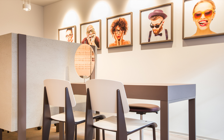 Die Materialkombination von Kupfer, Beton und feinen Grautönen erzeugen einen hellen und leichten Raumeindruck. Eine Kupferplatte dient als Hintergrund für die Brillenpräsentation an den Wänden. Für die liegende Brillenpräsentation stehen Verkaufskorpusse aus Beton im Raum. Zwischen den Korpussen stehen Besprechungstische, konzipiert für stehende Beratung. Nebst den natürlichen Materialien wie Kupfer und Beton, schmückt ein gewobener Kunststoffteppich den Boden. Die eingesetzten Occio Leuchten setzten die Brillen gekonnt in Szene und leuchten den Raum optimal aus.