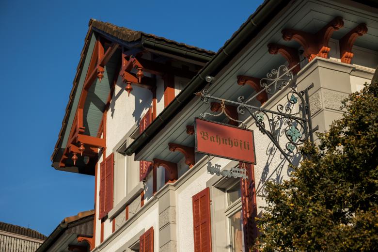 Das wunderschöne historische Restaurant Bahnhöfli in Entlebuch erstrahlt durch ein neues Farbkonzept der Fassade in neuem Glanz. Die Innenarchitektur lässt im Gastraum die Atmosphäre der damaligen Architektur wieder aufleben, war doch vielem davon in den 90ern bei einem Umbau zu wenig Beachtung geschenkt worden. So wurden die Wandverkleidungen im Stil der oberen Stockwerke ergänzt. Die oxydrote Farbe von früher findet sich sowohl aussen als auch im Innenraum in verschiedenen Oberflächen wieder.