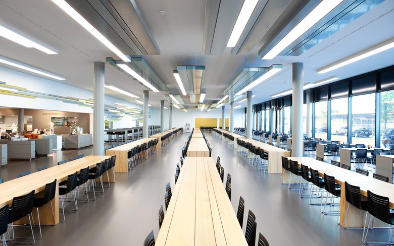 Das Konzept greift mit modernen langen Tischen die traditionelle „grosse Tafel“ auf, die die gemeinsame Mahlzeit fördert. In der Cafézone, die in Steh- und Loungebereich gegliedert ist, klingt in entspannter Atmosphäre die Mittagspause aus. Das grosse Raumvolumen wird durch die gestaffelte Farbnuancierung der Decken- und Wandelemente zoniert.