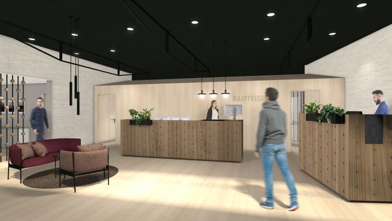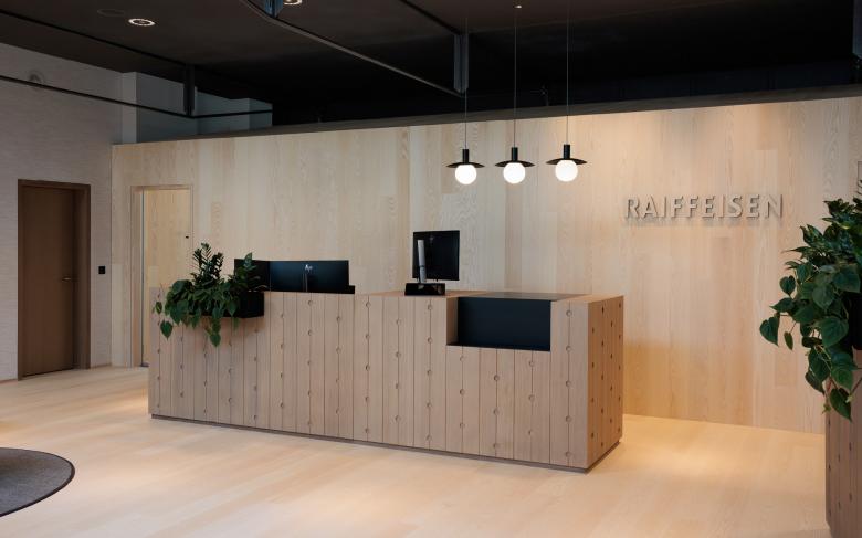 Der einladende Raumeindruck der neu gestalteten Beraterbank in Lützelflüh spiegelt den architektonischen Anspruch der Raiffeisen Gruppe wider. Die Geradlinigkeit in der Gestaltung verleiht den Räumlichkeiten Modernität und Grosszügigkeit, während liebevolle Details Elemente des Emmentals und des Bankwesens spielerisch aufgreifen.