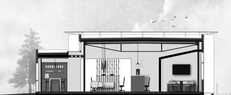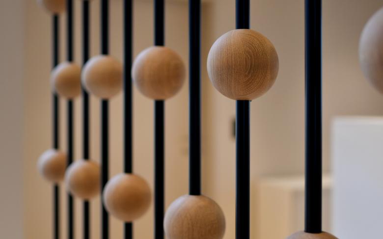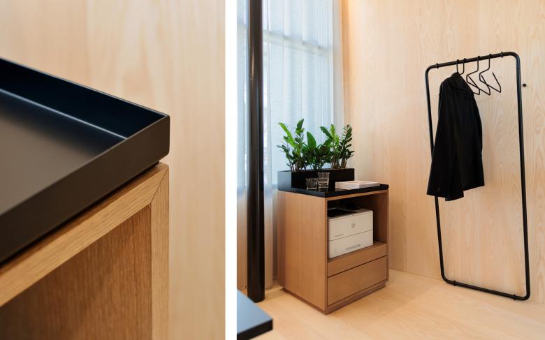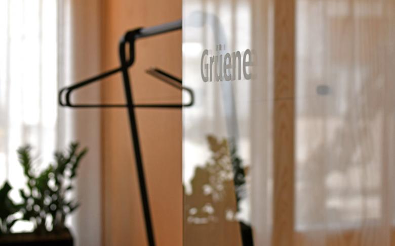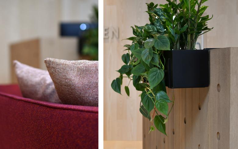 Durch die Raumeinteilung und den Holzkubus, der an ein stilisiertes Holzhaus erinnert, entsteht eine aufgeräumte und warme Stimmung. Der Empfangskorpus zeigt eine besondere Oberfläche - seine Ornamentik ist eine moderne Interpretation der Balkongeländer aus dem Emmental. Im Zentrum befindet sich eine Insel mit schlichten Polstermöbeln, die zum Warten einladen. Ein Raumteiler dahinter schafft eine halboffene Grenze zu den Arbeitsplätzen. Dieser greift die Ornamentik des Empfangs invertiert auf und erinnert an einen Zählrahmen. Der Einsatz von hellem Eschen- und dunklerem Eichenholz schafft ein natürliches Gesamtbild. Die dunkle Decke bringt Ruhe und lässt die bestehenden Träger in den Hintergrund treten. Deren From wird dennoch in der Dachschräge des Holzkubus aufgenommen. Die neuen Raumeinteilungen entstehen durch minimale Eingriffe in den Bestand, welche Nutzung und architektonischen Eindruck deutlich verbessern. Die zeitlose Gestaltung, die das Umfeld auf moderne Weise spiegelt, trägt zu einem nachhaltigen Umbau bei.