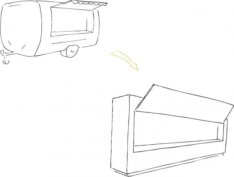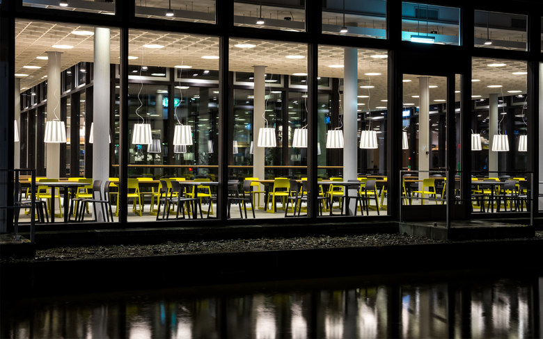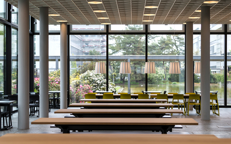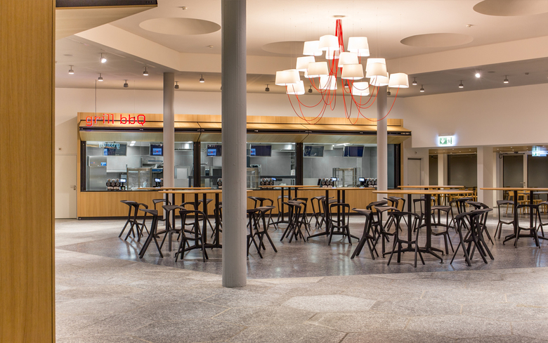 Wie um einen Marktplatz gliedern sich die drei Essens-Counter des food market an der ETH Zürich auf dem Campus Hönggerberg. Und wie Marktstände werden sie bei Betrieb geöffnet und zeigen sich im geschlossenen Zustand als schlichte Holzkuben. Der Platz, der in der Mitte entsteht, ist Begegnungsfläche und Imbiss-Bereich zugleich. Das abwechslungsreiche Mobiliar bietet mit verschiedenen Stühlen, Barhockern und Bänken unterschiedlichste Sitzformen und gliedert somit den Raum. Auch die Beleuchtung, die aus einer Kombination von auffälligen Pendelleuchten und funktionalen Leuchten besteht, sorgt für die Akzentuierung der verschiedenen Bereiche und lässt trotz der Grösse des food market eine behagliche Atmosphäre entstehen. Beim Umbau wurden denkmalgeschützte Elemente, wie das prägnante Deckenraster, erneuert und in die neue Gestaltung integriert.