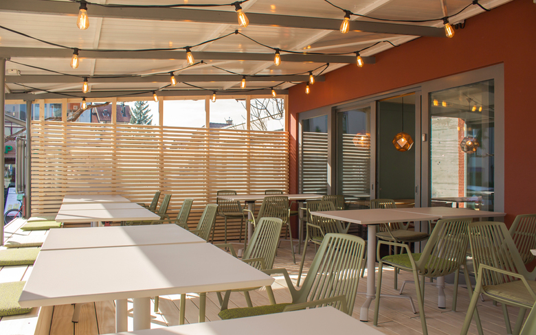 Das Getränkebuffet nutzt den vorhandenen Raum und wird gleichzeitig zum langen Tisch für die Gäste. Kupferfarbene Elemente schaffen einen Kontrast zu den Grüntönen, die zusammen mit viel Holz die Natürlichkeit des Restaurants unterstreichen. Mittels einer Stufe wurde die helle Terrasse auf zwei Ebenen verteilt und verbindet Innen- und Aussenraum. Die Leuchten und die schräge Flaschenwand bilden schon von Aussen einen attraktiven Blickfang.