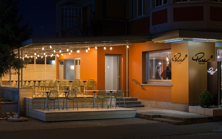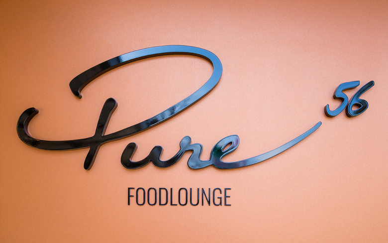Das Restaurant Pure 56 befindet sich in Räumlichkeiten, die bereits vorher ein Restaurant waren. Die alte Raumhülle, wie Boden und Decke, wurden geschickt integriert damit sich die alten und neuen Elemente harmonisch zusammenfügen.