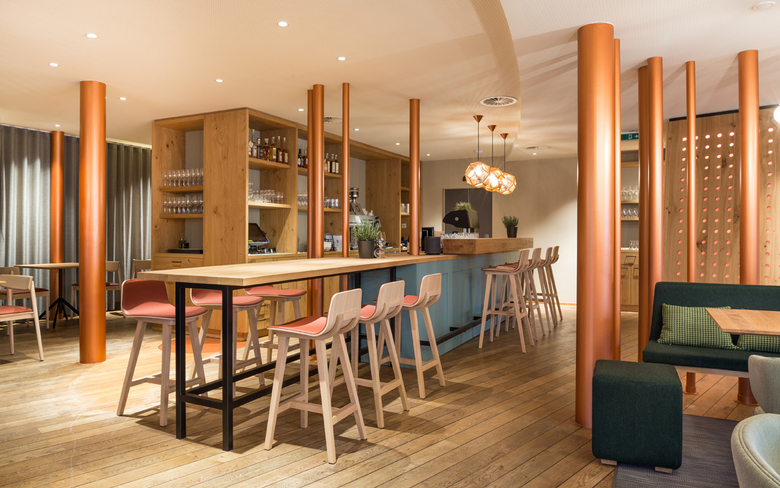 Da die vorhandenen statischen Säulen keiner Raumgliederung folgten, wurden sie durch das innenarchitektonische Konzept noch vermehrt und so optisch als Raumteiler genutzt. Wo sich eine kühle Glaswand zum benachbarten Geschäftslokal befindet, entstand durch hinzufügen eines Vorhangs ein ruhiger Sitzbereich. Der bestehende Eichenparkett-Boden wurde mit einem ins Farbkonzept passenden Teppich ergänzt, wo jetzt ein neuer Schwerpunkt mit gemütlichen Loungemöbeln entstand. Das Rückbuffet bei der Bar ist als Holzregal konzipiert und strahlt trotz der benötigten Infrastruktur Wohnlichkeit aus.