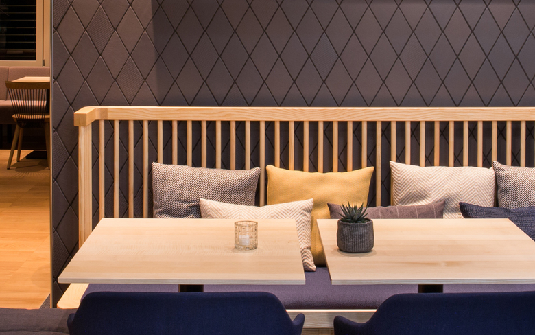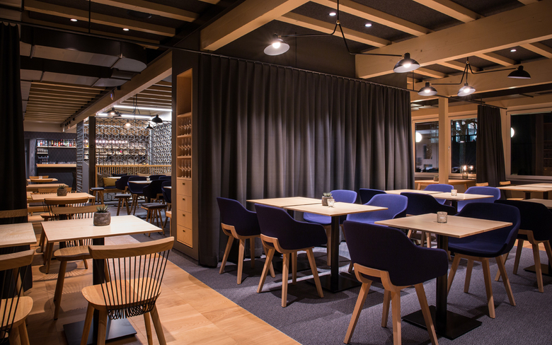 Das zur Tennishalle angrenzende Restaurant erstrahlt seit dem 15. Dezember 2018 in neuem Glanz und lädt auf 180m2 nicht nur nach dem Sport zum Essen und Verweilen ein. Der Entwurf im nordischen Stil hebt das bestehende Gebäude in Holzbauweise hervor und bietet 104 Sitzplätze. Der Bestand wurde grosszügig geöffnet und mit einem Teppich als Bodenwechsel eine Insel um die tragende Wandscheibe geschaffen. Die Rautenform wurde als gestalterische Neuinterpretation des Geflechts eines Tennisschlägers mittels hochwertigen Wandfliesen integriert. Die vertikale Erschliessung - der Treppenkern - wird mit einem perforierten Raumtrenner aus Rauten betont und so zum Blickfang. Die Raff-Vorhänge an den Fenstern in Richtung Tennishalle bieten die Möglichkeit die warme Lichtstimmung trotz ausgeleuchteter Sporthalle am Abend zu bewahren. Die Material- und Farbkombination aus Eichen- und Eschenholz, Messing, Anthrazit, Saphirblau und Honiggelb verleihen dem Raum in Kombination mit den geometrischen Formen eine spannende Atmosphäre, welche durch die warme Lichtstimmung verstärkt wird. Mit den unterschiedlich generierten Sitzgelegenheiten und den diversen saisonalen gutbürgerlichen Spezialitäten bietet das Restaurant Schlossfeld für jeden das passende Angebot.