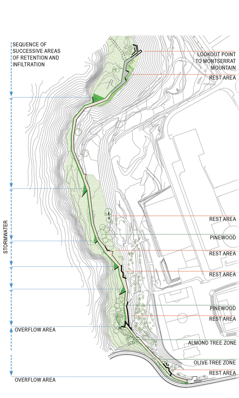 The project has two main objectives: one of connectivity, achieving the continuity of this global green ring recognizing the main visuals about the city and Montserrat mountain, and generating a sequence of areas of stay; and a second of landscape and biodiversity recovery, establishing the necessary elements to generate a new dynamic in the place that progressively improves its environmental conditions through the profit of water.