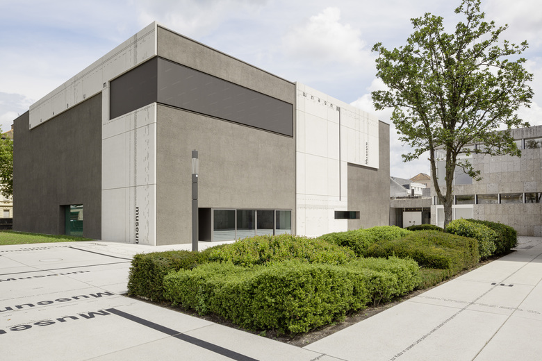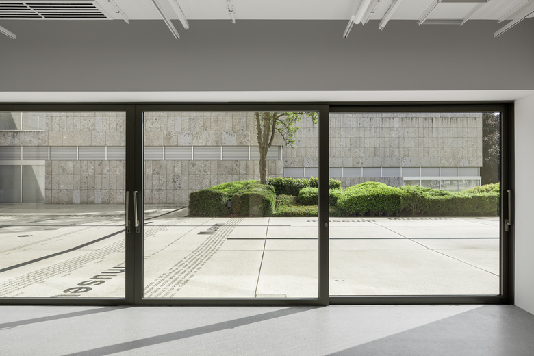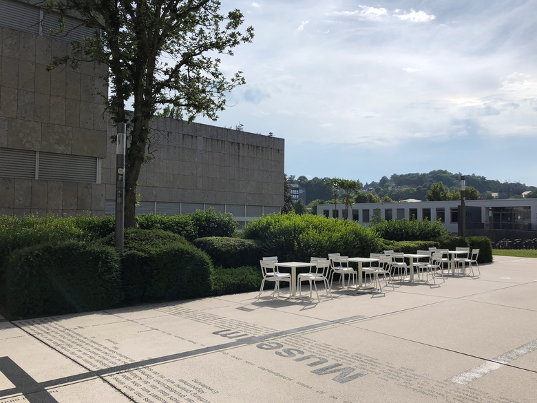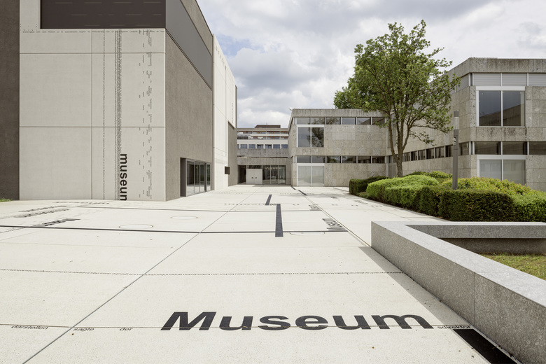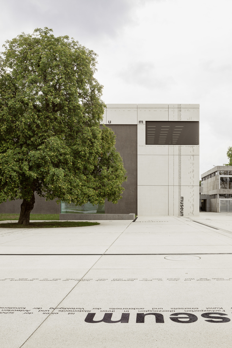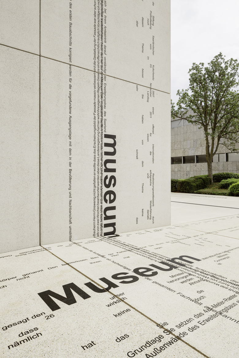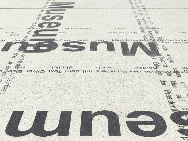 Die Werksteinplatten wurden nach ihrer Anbringung vor Ort mittels Schablonen beschriftet. bbz landschaftsarchitekten unternahmen umfangreiche Recherchen zur Materialität des Kunstwerks von Michael Riedel. Gesucht war ein Material, das eine möglichst große Homogenität besitzt und sowohl als Material für Bodenbelag und Fassade geeignet ist. Die gewählten, nahezu weißen großformatigen Platten von 4 x 4 m mit schwarz applizierter Schrift greifen das Raster des Altbaus der Modernen Galerie von Hanns Schönecker auf. Als vorfabrizierte Werksteinplatten stellen sie in dieser Größe als Bodenbelag im Außenraum ein absolutes Novum dar. Die Homogenität bezüglich Fassade und Außenraum sowie Schriftauftrag und Applizierung waren ebenfalls Gegenstand umfangreicher Recherchen.