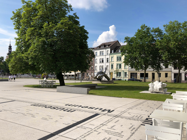 Während an der Nordseite der Modernen Galerie zwei prominente Monumentalplastiken das Areal betonen, findet sich südlich des bestehenden Museumsgebäudes der Skulpturengarten, der zur gleichen Zeit wie die Pavillons der Galerie entstanden ist. Er ist geprägt von wertvollen alten Gehölzen und einer Vielzahl von Skulpturen die mit der bestehenden Sammlung eng verknüpft sind und von einem Rundweg aus mit Blick auf die Saar betrachtet werden können.Der westliche Platzbereich zwischen Eingang des Museums und Hochschule für Musik dient als attraktiver Vorplatz für beide Gebäude und als großzügiger Außenbereich für die Museumsgastronomie. Der östliche Platzbereich stellt den Vorplatz für die Museumsverwaltung dar und fungiert zugleich als Zufahrt für die Anlieferung des Museums.