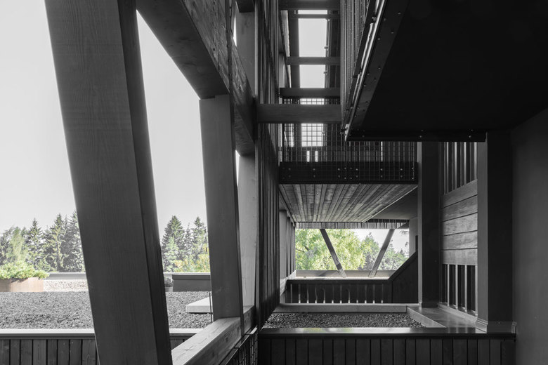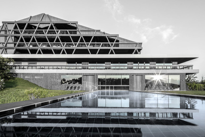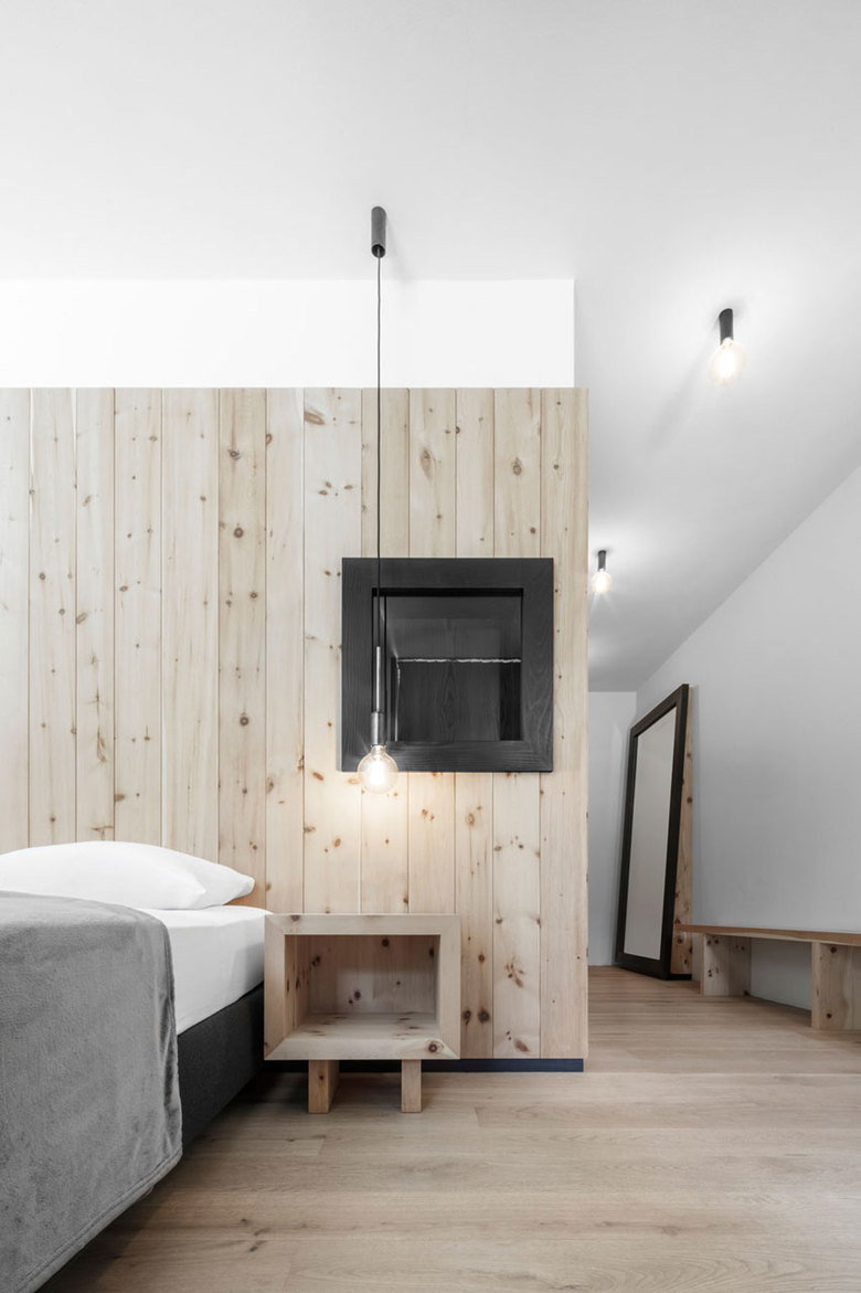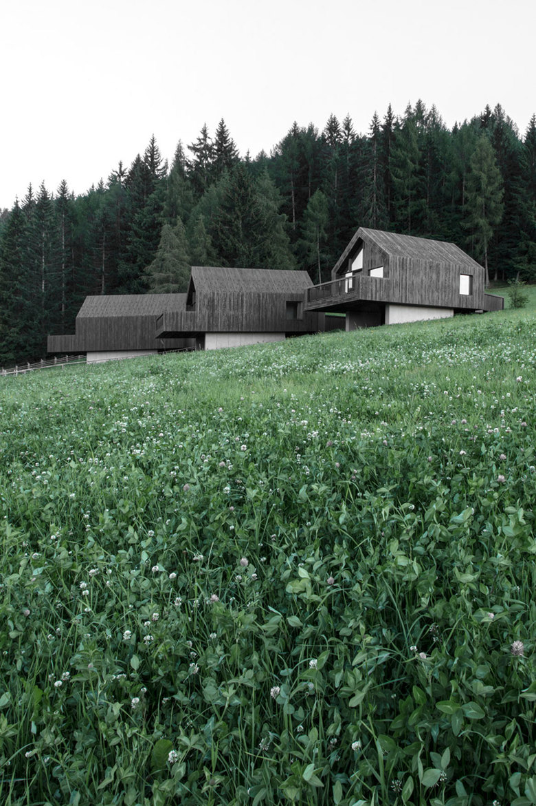 ein weiterbauen im bestand, ein integrieren des denkmalgeschützten stadels, ein bauen in der landschaft. es geht um verbindungen zwischen neu und alt mittels wegräumen und gezielt gesetzten maßnahmen, die mit dem gesamten eine einheit bilden. die landschaft wird zum thema, wird teil der architektur und umgekehrt. ein sich zurücknehmen, ein suchen von bewusst gewählten positionen. ein verschwinden in der landschaft. auch hier das material als verbindungselement zwischen alt und neu, zwischen innen und außen.