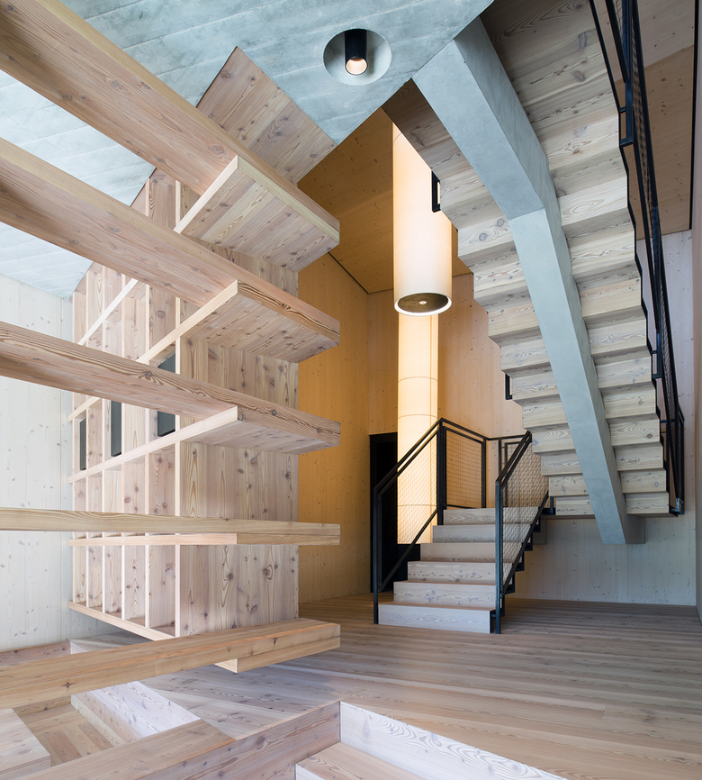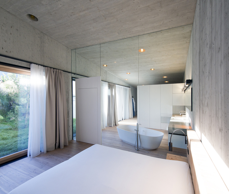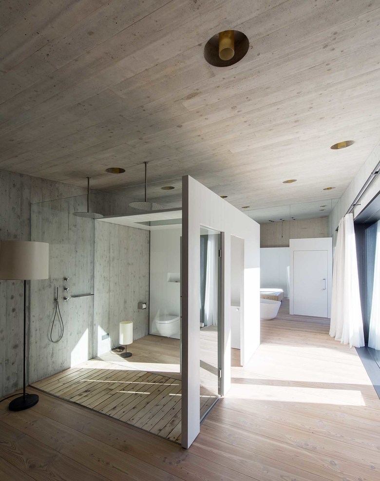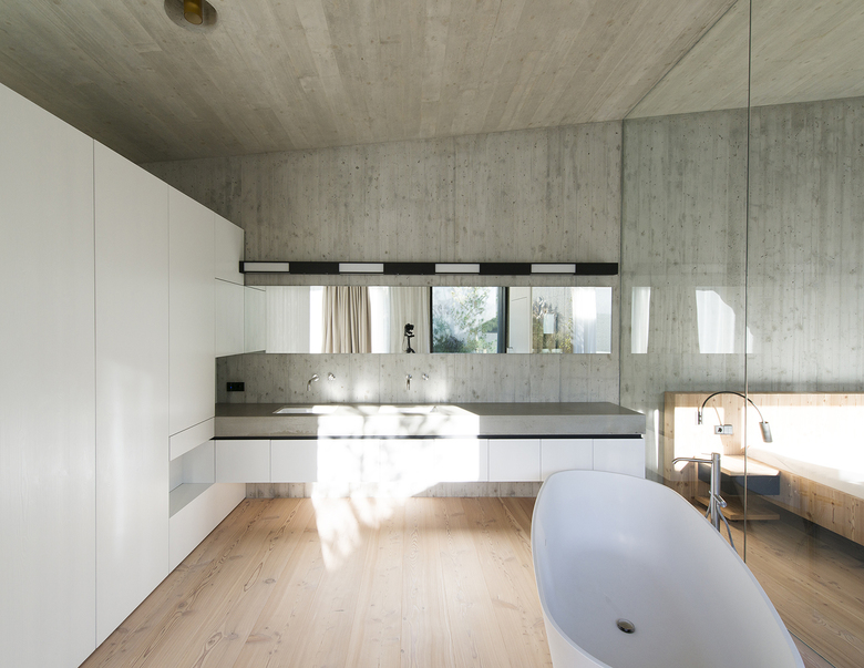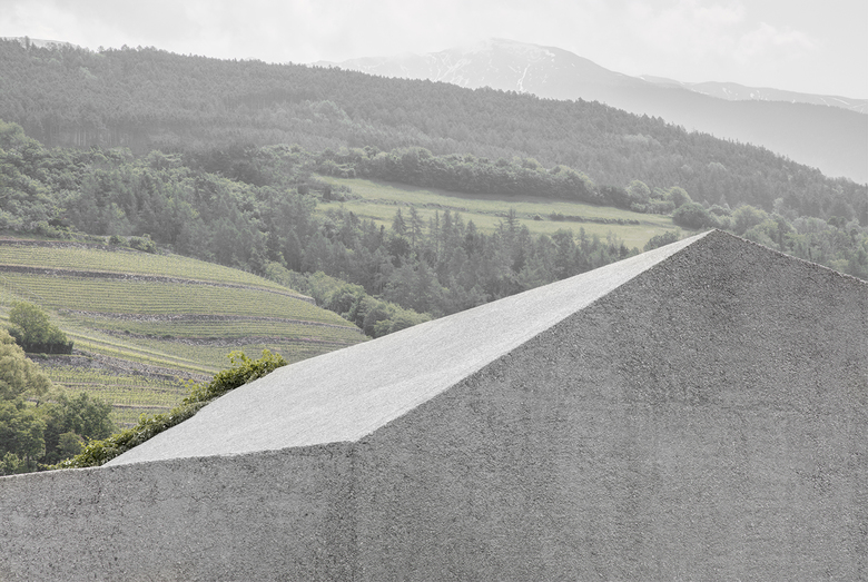 das neue wohnhaus entsteht unmittelbar neben dem elterlichen bauernhaus, auf dem hügel oberhalb des kloster neustifts. ein gebäude, das in seinem ursprung mit der landschaft verwurzelt ist und nach oben wachsend teil der reblandschaft wird. ein langgezogener körper, der sich im geländeverlauf zu einer hofsituation ausweitet. das gebäude wird teil der rebhänge, der landschaft. es entsteht eine neue „mitte“, ein offener, aber intimer bereich, ein innenhof, um den sich der monolith schmiegt. außen der rohe gewaschene beton, innen ein holzbau in sich stehend, der zugleich die konstruktive und statische funktion als dachträger übernimmt. ein weiterführen, ein sich öffnen, ein herauswachsen. ein spiel mit zwischenräumen, mit höhen und ausblicken.