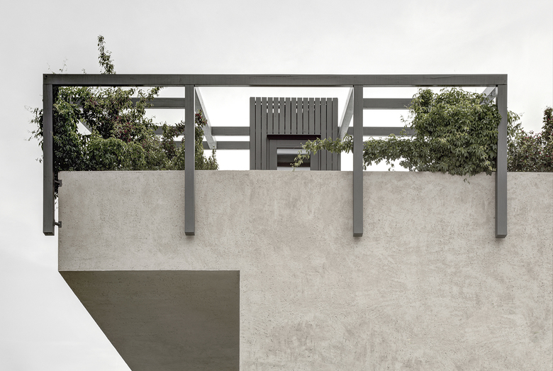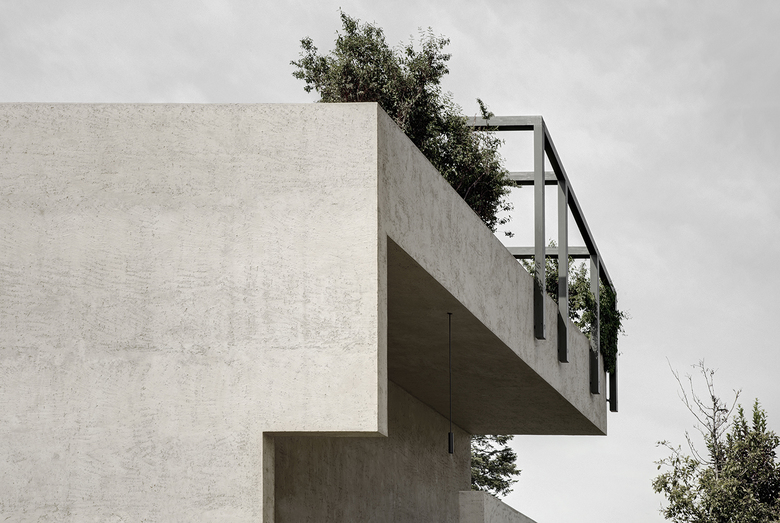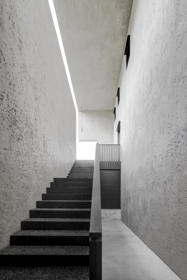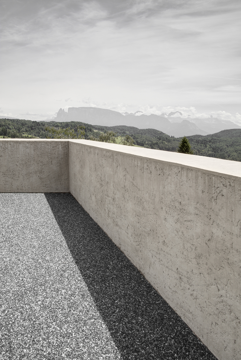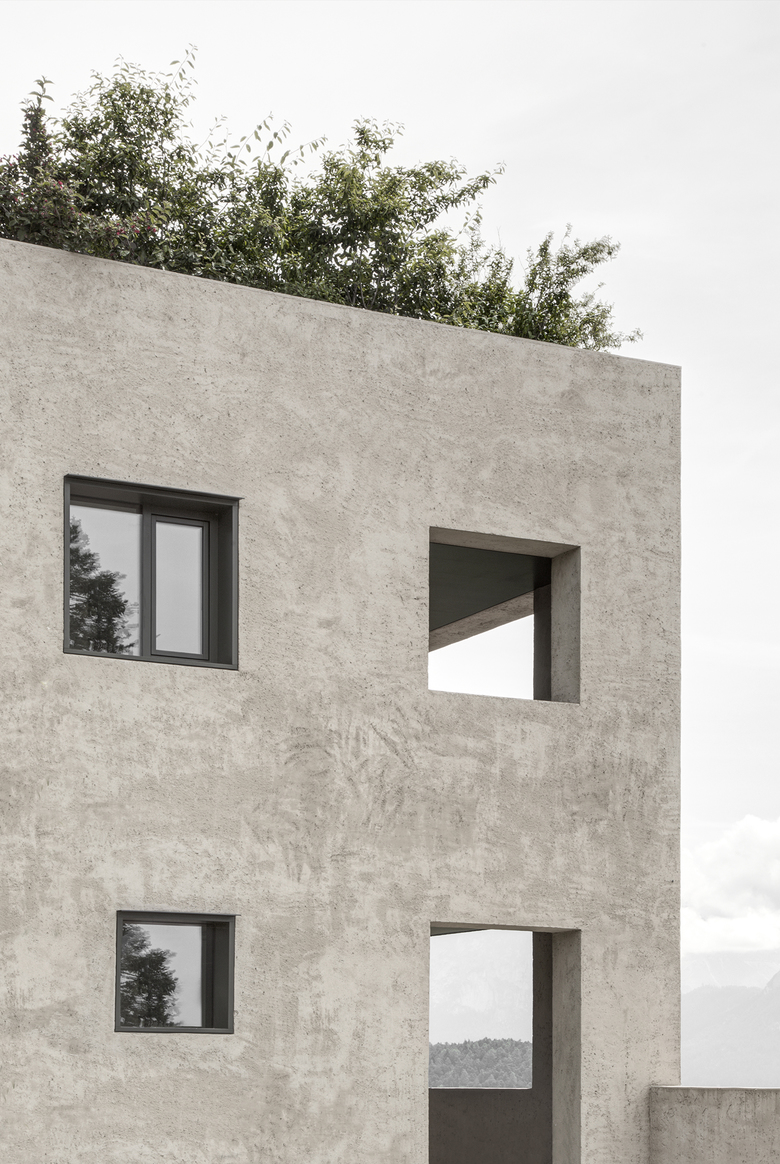 das haus h ist, gemeinsam mit dem familieneigenen parkhotel holzner, teil des ganzen und dennoch intimer rückzugsort – ein wohnen in der landschaft. ein monolith, einfach geformt in den hang gesetzt. das gebäude integriert sich im gelände – führt eine geländekante weiter. eine geradlinige formensprache, gezielt auf reduktion, eine grobe, erdfarbene körnung im beton charakterisiert die oberfläche des hauses, die von intimen, nach innen versetzten terrassen und loggien unterbrochen wird und fast abweisend in richtung gleis wirkt. alles nimmt sich zurück, sei es in der architektur als auch in der materialwahl. das haus ist schlusspunkt der parklandschaft. die idee bestand darin, verbindende elemente zwischen privathaus und hotel zu finden, zusammenhänge zu schaffen, um ein weiterführen von inhalten, von geschichte zu ermöglichen.