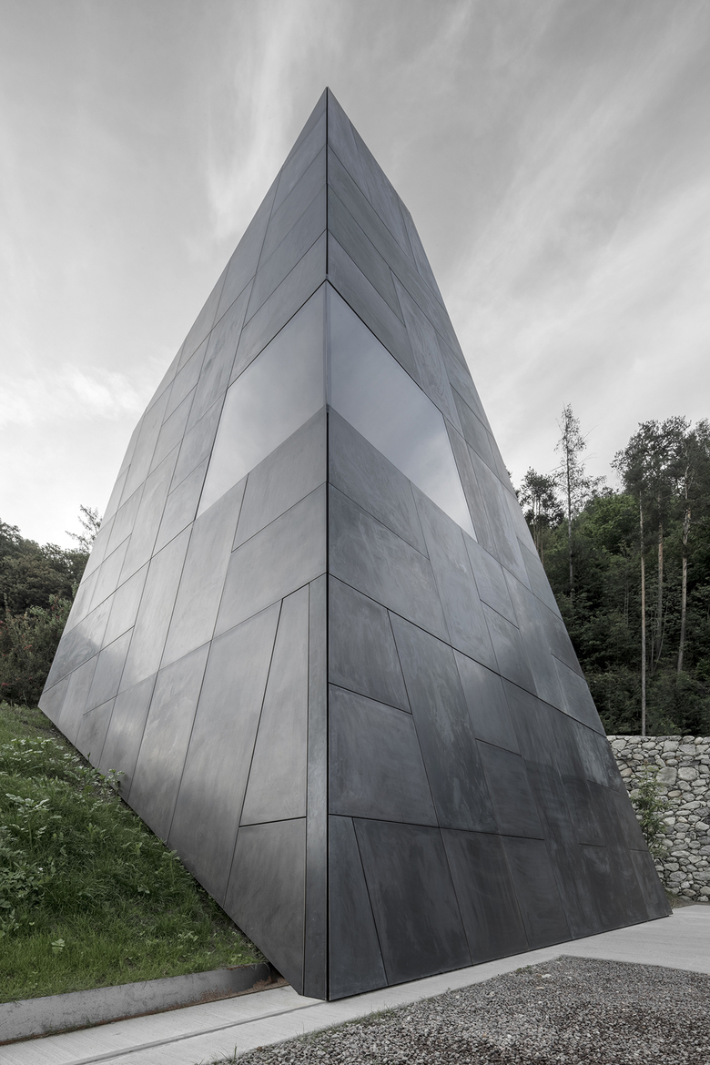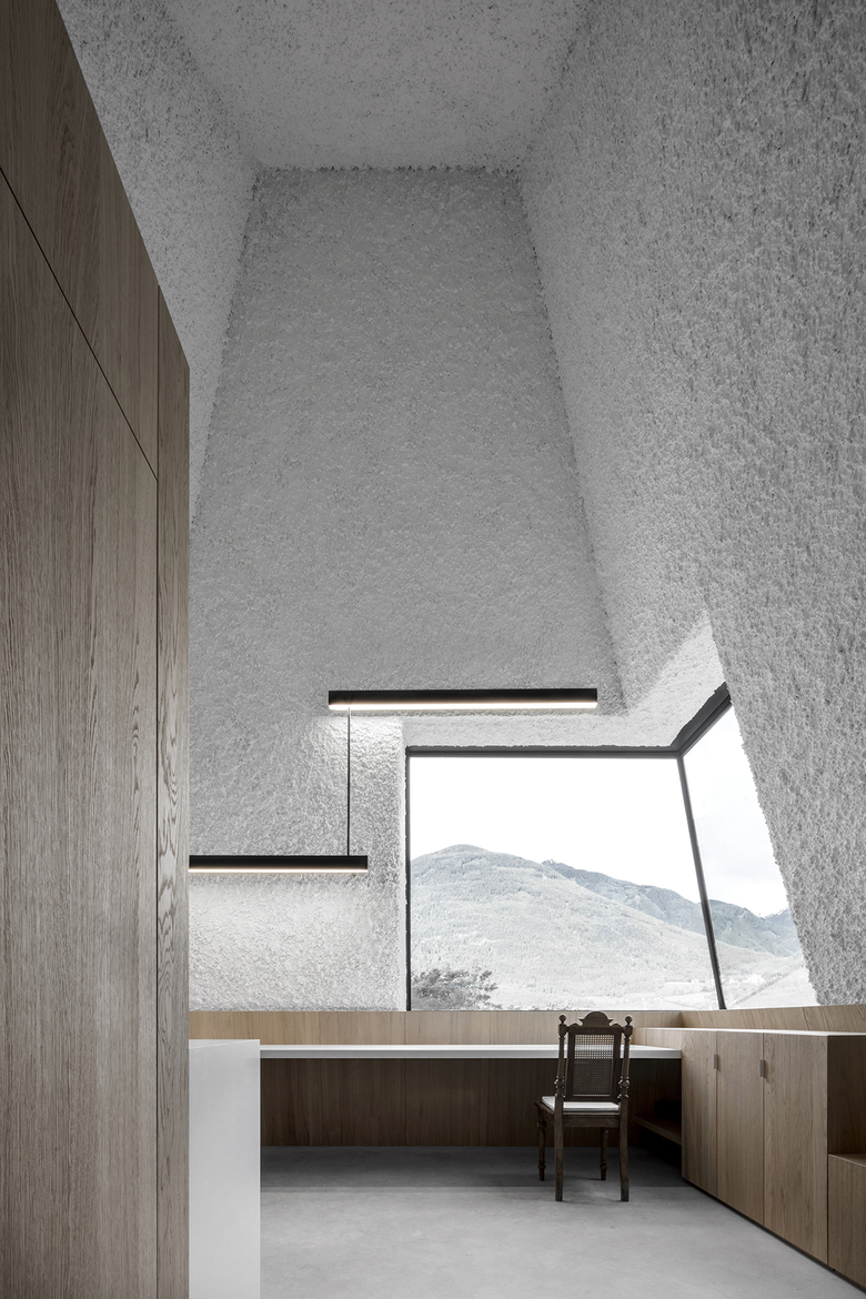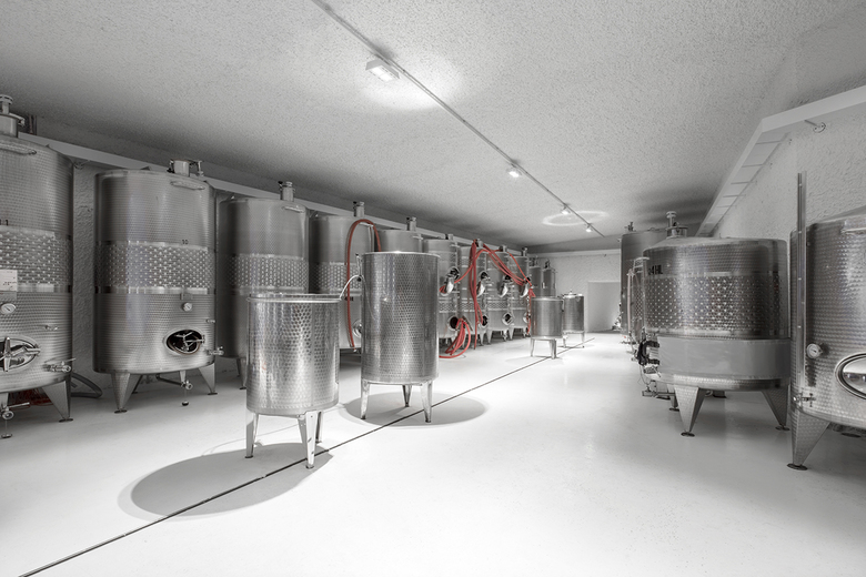 andockend an den bestehenden, historischen säulenkeller aus dem jahre 1450, mit einem treppentunnel verbunden, entsteht in einer art verlängerung der neue trapezförmige keller. die neuen kellerräume dienen der weinproduktion, in der sich die edelstahltanks und die grobe weiße körnung des putzes, von wand und decke, in eine art materialspiel vermischen. eine verfremdung in der reflexion. am ende erwächst aus dem keller ein trichterförmiger, polygonaler turm aus bronze und wird teil der landschaft. er beinhaltet einerseits den technischen ablauf der ernte und andererseits die kommunikationsebene mit blick in die reblandschaft. der historische keller gepaart mit dem neuen ist teil eines parcours, der in die geschichte bzw. der eingang zum keller ist durch eine betonwand gekennzeichnet, die zwei funktionen hat: einerseits dient sie dazu, den besucher zum parkplatz zu leiten, andererseits begleitet sie die rampe, die zum neuen keller führt.in das neue der kellerei pacherhof führt. eine zeitreise in die tradition, sei es beim arbeiten, von eichenfässern bis hin zu edelstahltanks, sei es in der architektur, von gewölben in verbindung mit zeitlosem. ein spiel von natürlichem und künstlichem licht und von materialität.