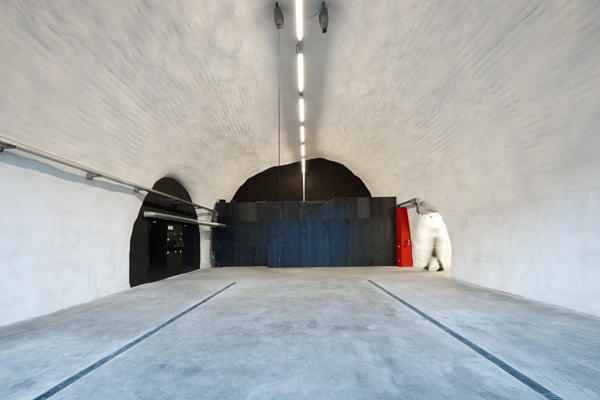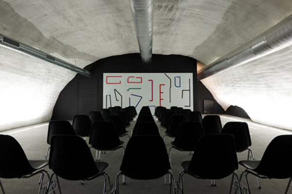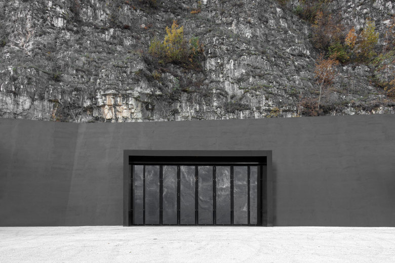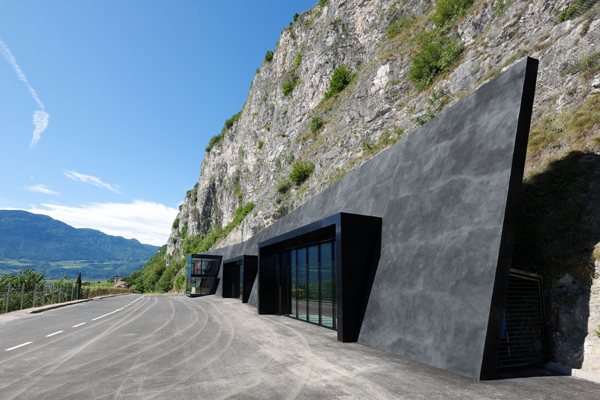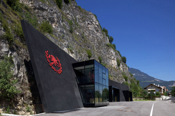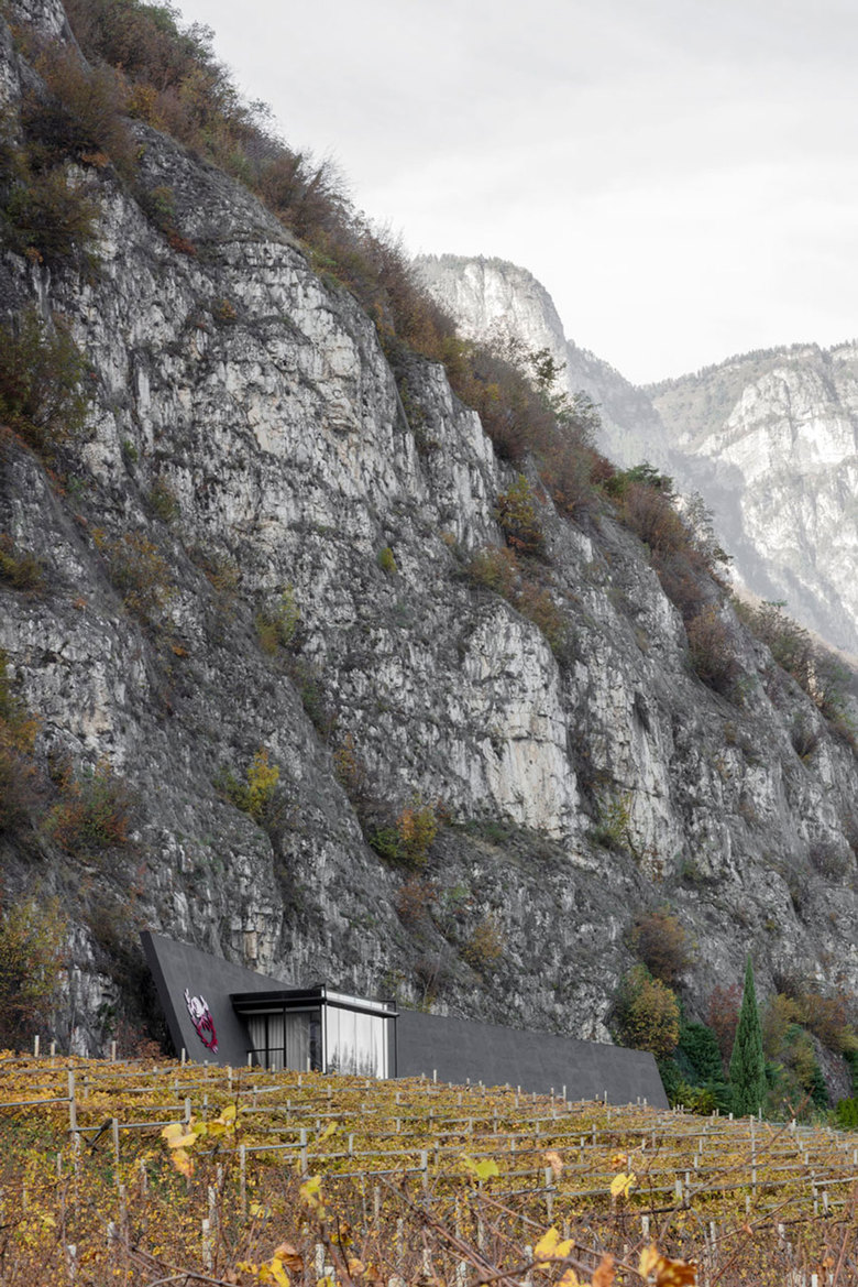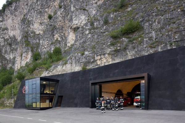 eine felswand wird schauplatz der neuen feuerwehrhalle von margreid an der weinstrasse. drei große kavernen im berg, durch einen querstollen miteinander verbunden, bilden die innenräume der feuerwehrstation. zwei kavernen für die fahrzeuge und eine für die verwaltung. in einem abstand von einem meter wird eine schwarz eingefärbte und geknickte betonwand im neigungswinkel des dahinter stehenden felsens, vor den berg gestellt. die drei kavernenstollen docken unmittelbar hinter der stahlbetonwand an. diese wand dient der absturzsicherung und ist zugleich architektonisches element der feuerwehr. die materialwahl fiel auf beton: beständig, stark und mächtig, der dunkle farbton wurde durch das aufbringen von buchenkohlestaub erreicht und ähnelt verbranntem holz.