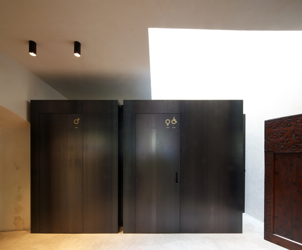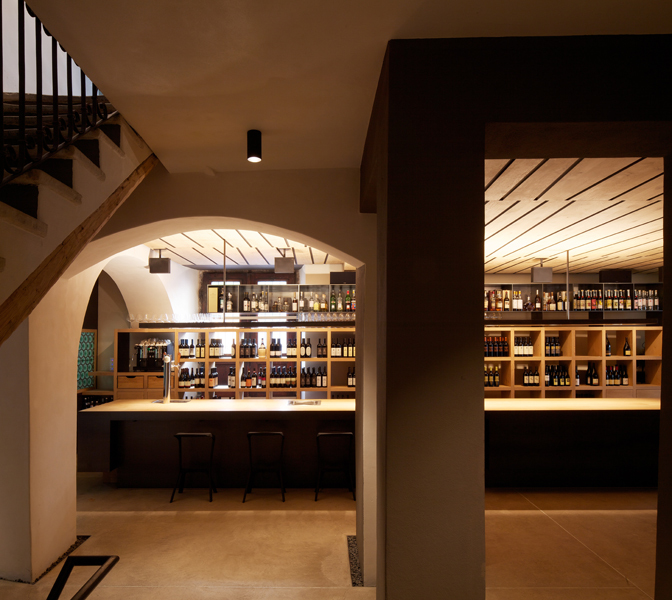 wichtige elemente als „körper im raum“ sind die breite theke, die weinbibliothek, der wc-körper und das backoffice, die als freie elemente in die alten räume gestellt wurden.