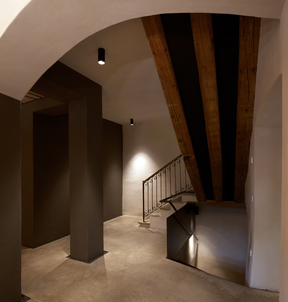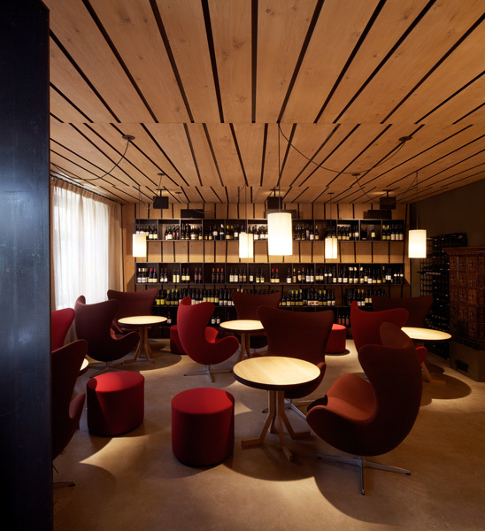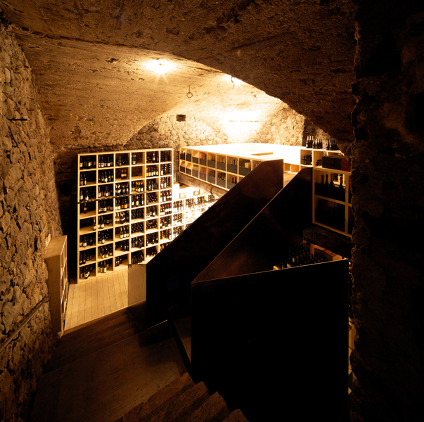 durch einen stahlkubus, nach innen als windfang und weinkühlschrank ausformuliert, betritt man die neu gestalteten innenräume des wirtshauses von 1543. räume und bestand werden so belassen, wie sie sich geben – es entsteht ein raumkonzept, welches das bestehende mit dem neuen in einklang bringt. ein arbeiten mit dem historischen bestand, ein behutsames hineinstellen, ein restaurieren. die räume, ebenen bekommen fast einen dorfcharakter mit plätzen zum verweilen.