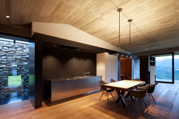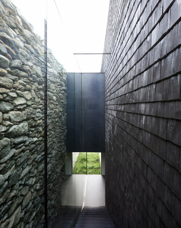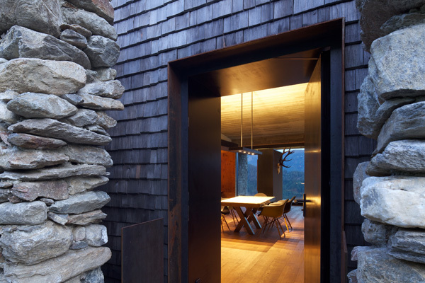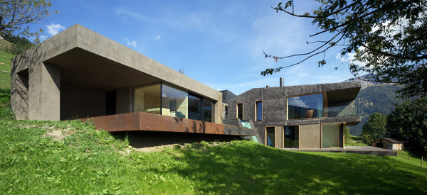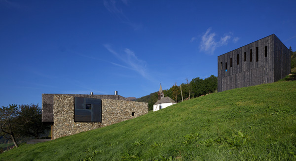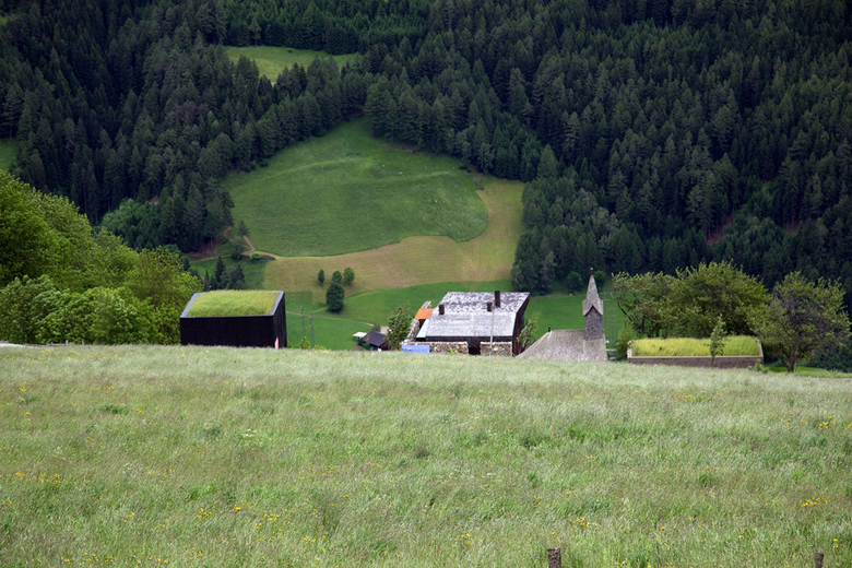 gemeinsam mit der historischen kapelle entsteht in einem weiler oberhalb von sterzing ein gebäudeensemble: eine garage mit hühnerstall ragt aus dem berg, eine kleine sauna mit erdfarbener fassade steckt weitgehend im gelände, öffnet sich aber mit großer glasfront zum tal. hinter der in traditioneller schichttechnik errichteten steinmauer befindet sich das eigentliche wohnhaus als schindelverkleideter baukörper am berg. die architektur orientiert sich an der topografie, ohne sie zu verändern. das gesamte projekt ist geprägt durch offenheit und zurückhaltung. es entsteht ein spiel zwischen architektur, landschaft und kunst. durch die schriftinstallationen von lois und franziska weinberger erhalten alle häuser ihren namen, wie es in früheren jahrhunderten brauch war.
