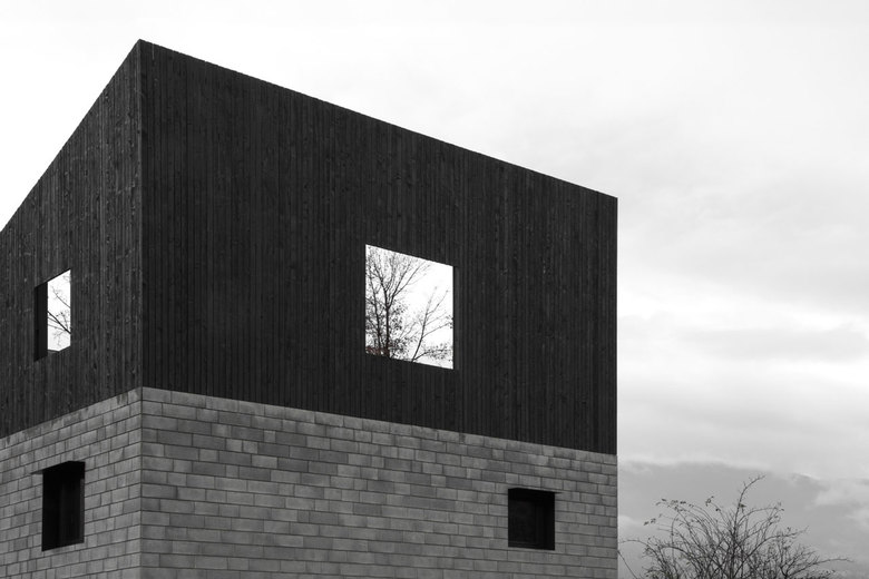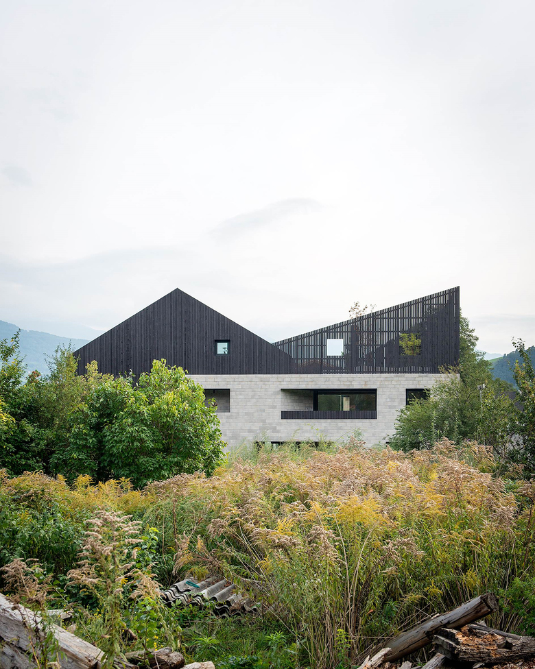 das satteldach, die dachspitze und die überdachung der fenster waren führende themen in der konzeption des entwurfes. die bergspitzen, die die kulisse des gebäudes darstellen, aber auch die traditionellen bauernhöfe, die den charakter der gegend stark prägen, werden auf eine abstrahierte art und weise in der neuen architektur zitiert und neu interpretiert. durch eine parallelverschiebung des grundrisses ermöglicht der entwurf zwei häuser unter einem dach. die für die beiden schwestern unterschiedlich gestalteten wohnungen sind stark darauf ausgelegt den außenraum und die natur nach innen zu holen. die loggien finden tief im gebäude ihren platz, während der dachgarten von dem weitergeführten fassadenband geschützt wird. das zusammenspiel der beiden verwendeten materialien, betonziegel in verbindung mit einer schwarzbraunen holzlattung, verbildlicht die dualität, die im innenraum herrscht.