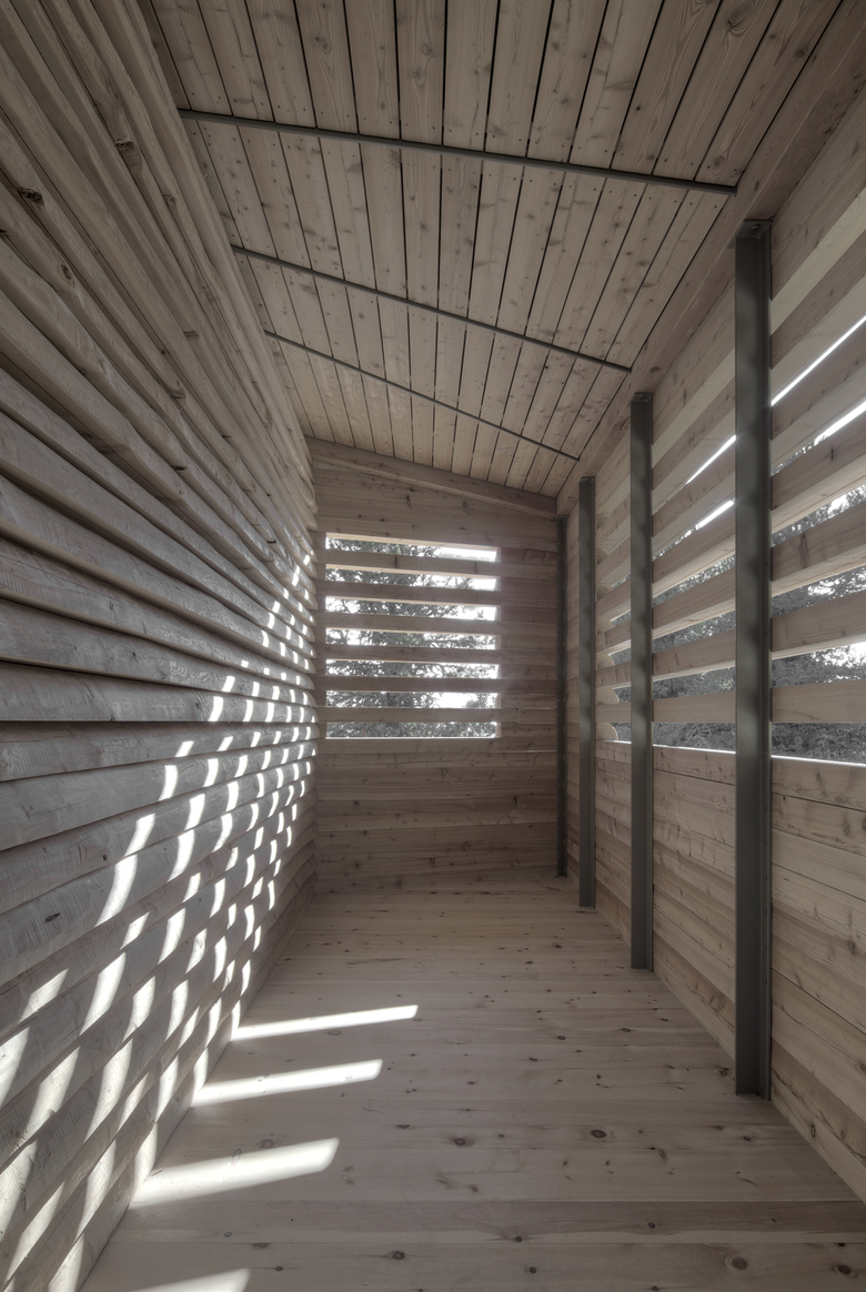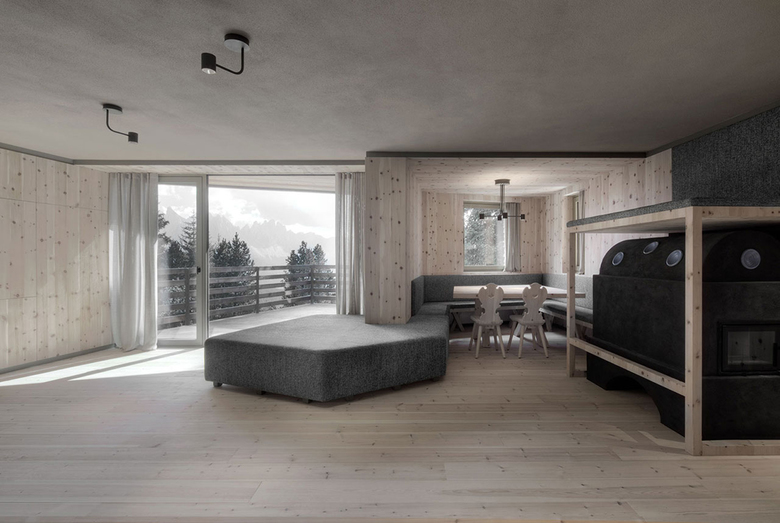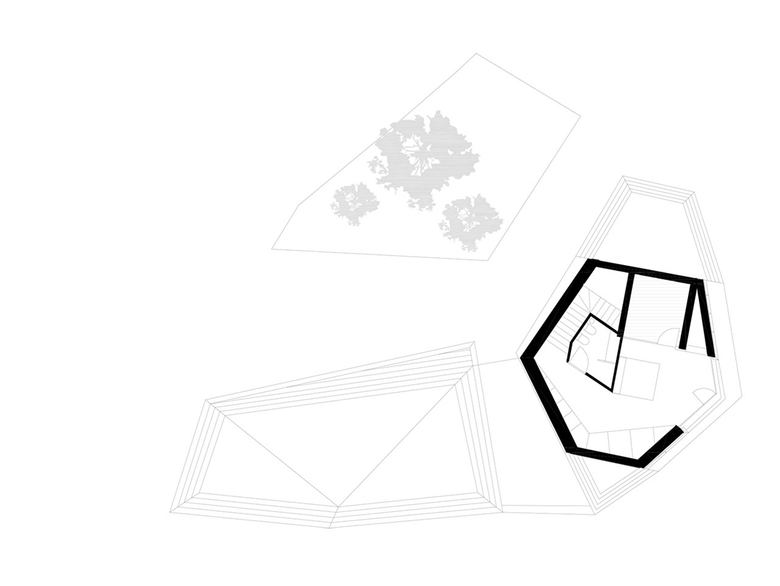 das projekt – fünf ferienwohneinheiten um einen gemeinsamen innenhof gedreht – versucht mit den lokalen gegebenheiten, mit der landschaft, dem ort eins zu werden. anlehnend an die häuser der nachbarschaft werden die traditionellen materialien stein und holz gewählt: naturbelassener stein für den sockelbereich und geviertelte baumstämme für die fassade. das in den hang gesetzte haus folgt der topografie, bricht dort wo es auf die geländekante trifft. ein herauswachsen aus und verwachsen mit der landschaft, eine drehung. durch die positionierung des gebäudes längs der straße entsteht im hinteren bereich eine art hofsituation, eine aussicht richtung lichtung, ein ruhebereich in der natur. der in holz ausgeführte obere teil liegt auf dem sockel (garage) aus stein und richtet sich in höhe und bewegung nach der umgebenden dachlandschaft. das haus sucht nach freiblicken zwischen den nachbarhäusern und gibt weite blicke in die landschaft frei. es entsteht eine bewegung, eine dynamik in der die umgebung miteinbezogen wird, ohne die nachbarhäuser in deren wahrnehmung und deren ausblicke einzuschränken.