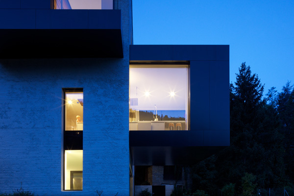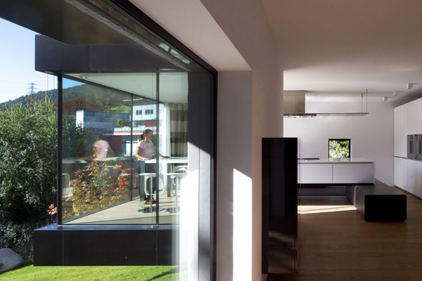 ziel des projektes war es, eine neue wohnqualität zu erzeugen, die sich außen am baukörper ablesen lässt. die verschneidung der einzelnen aus der fassade ragenden raumkörper mit dem basiskubus ergibt eine selbstverständliche zonierung – ein rau verputzter, betonähnlicher grundkörper, dem einzelne volumen hinausgeschnitten bzw. hinzugefügt sind. es entstehen geschützte lichthöfe und die charakteristischen großen „erker“, eine abstraktion eines für südtirol typischen baudetails. in ihren glasscheiben und schwarz glänzenden metallrahmen spiegeln sich landschaft, wolken und bäume des grundstückes, wodurch das gebäude teil der umgebenden natur wird. in den kubus eingeschnittene innenhöfe verstärken das gefühl des lebens mit und in der natur.