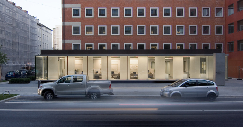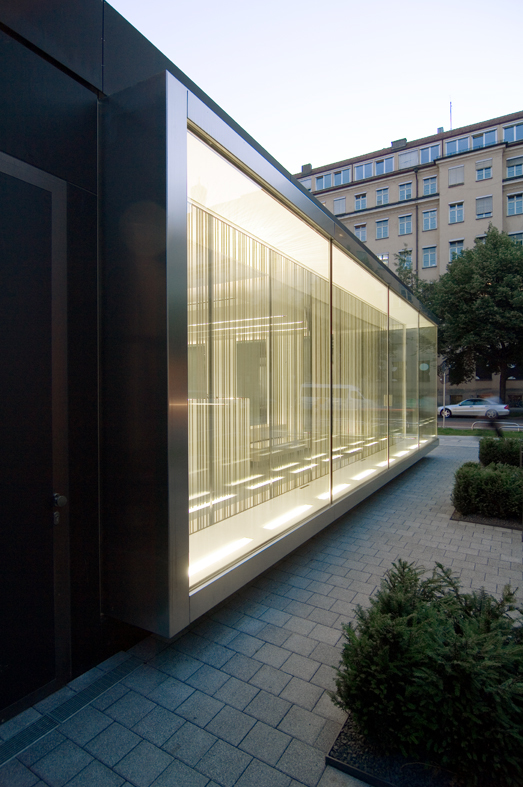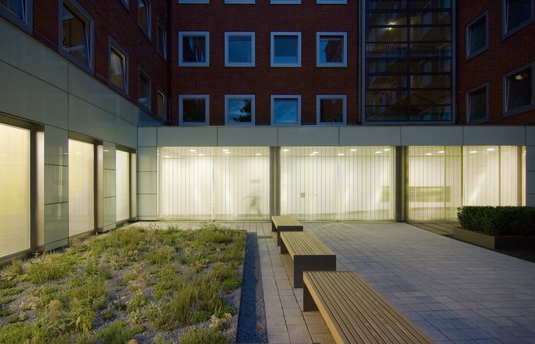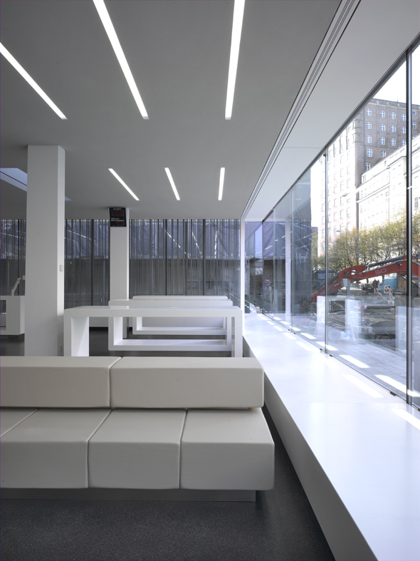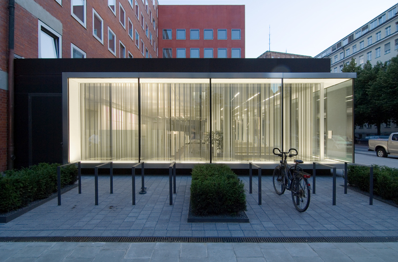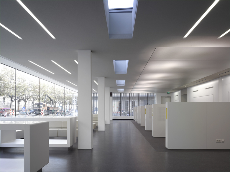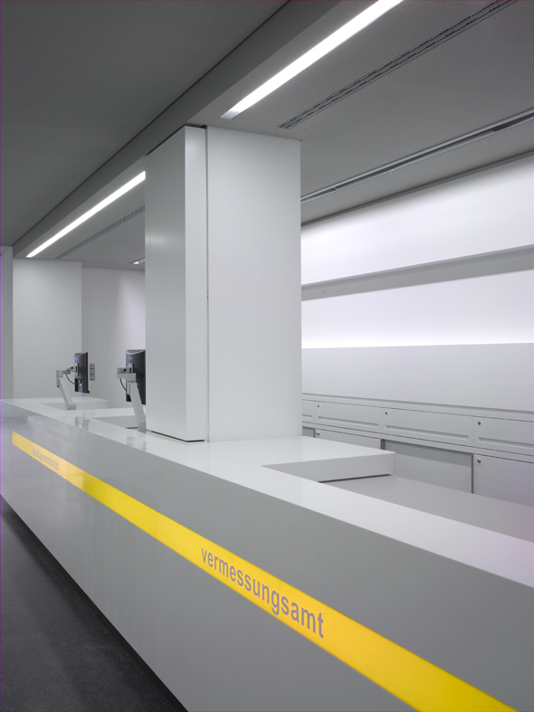 Sanierung, Umbau und Anbau Umbau der Erdgeschossbereiche mit Foyer, Infothek, Bueros und Innenhof. Anbau Pavilion mit Buergerberatung und unterirdischem automatischem Aktenlager. Alle Leistungsphasen in Projektgemeinschaft mit Straub Architekten.