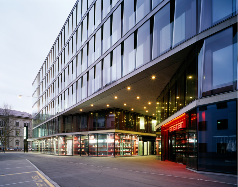 Während der Neubau des Wohn- und Geschäftshauses für die AZ-Medien-Gruppe im rückwärtigen Bereich unmittelbar an die Nachbarbauten anschliesst, tritt es an der Bahnhofstrasse als freistehendes Volumen in Erscheinung und fügt sich mit leichten Abdrehungen mühelos in die Reihe von repräsentativen Bauten ein. Die öffentliche Nutzung im Erdgeschoss und ein Durchgang, der die Bahnhofstrasse quer durch den neuen Block an die Altstadt anbindet, fügen den Neubau in die vorhandene Stadtstruktur ein. Diese räumliche Durchlässigkeit unterstreicht den öffentlichen Charakter des Gebäudes und stärkt die Eigenheiten des Ortes. Optisch unterstützt wird die neu geschaffene Verbindung im Bereich der Fussgängerpassage durch eine Volumenverengung auf der gesamten Gebäudehöhe. Sie erleichtert die Auffindbarkeit des zweigeschossigen Durchgangs und rhythmisiert die Längsfassade. Verfolgt wird sowohl ein Konzept des ergänzendverändernden Weiterbauens wie auch der expliziten Gegenüberstellung: Auf stadträumlicher Ebene wird die Grundkonzeption der die Bahnhofstrasse säumenden Stadthäuser beibehalten, wodurch sich das Gesamtvolumen in den Kontext einbindet, während in der Materialisierung neue Wege beschritten werden.