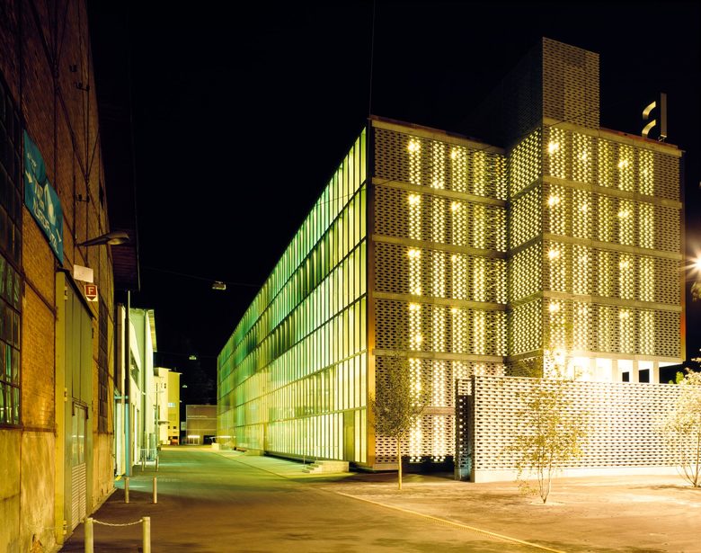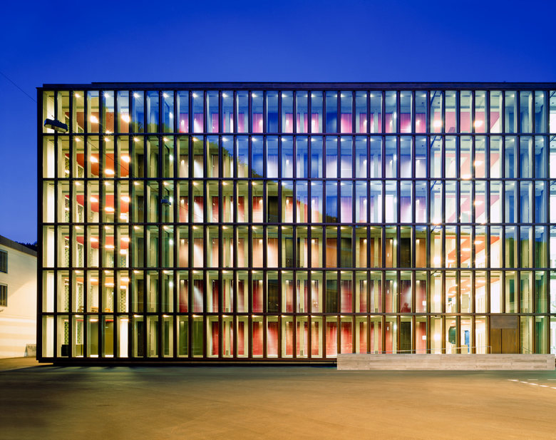 Eine geheimnisvolle Entrücktheit kennzeichnet das lange, vollflächig verglaste Gebäude mit seinen charakteristischen Fensterprofilen aus Baubronze. Der tektonisch klar strukturierte, in seiner wahren Grösse jedoch kaum fassbare Solitär ist massiv und transparent zugleich. Den Vorbeifahrenden enthüllt das Schulhaus seine Bestimmung kaum, in seiner formalen Abstraktion könnte es auch ein Büro-, ein Labor- oder sogar ein Wohngebäude sein. Auch im Innern tritt die Nutzung nicht sofort in Erscheinung, weil sich die Klassenzimmer im Kern konzentrieren und nicht bis an die Fassaden vorstossen. Die Erschliessung erfolgt mittels Säulenumgang über die volle Gebäudelänge entlang der Fensterfronten. Der architektonische Ausdruck ist geprägt durch die Reihung von Betonstützen, deren gleichmässige Zwischenräume mit Glas ausgefacht sind. Die Konstruktion tritt offen zutage, auch fehlen jegliche Wandverkleidungen. Die fünf in die Tiefe gestaffelten Stützenreihen dienen der Verschattung, der räumlichen Definition der Zimmer und Korridore und der Aufnahme der Haustechnik. Dabei mutieren sie je nach Sichtwinkel zur geschlossenen Wand oder geben den Blick frei in die nächste Raumschicht.