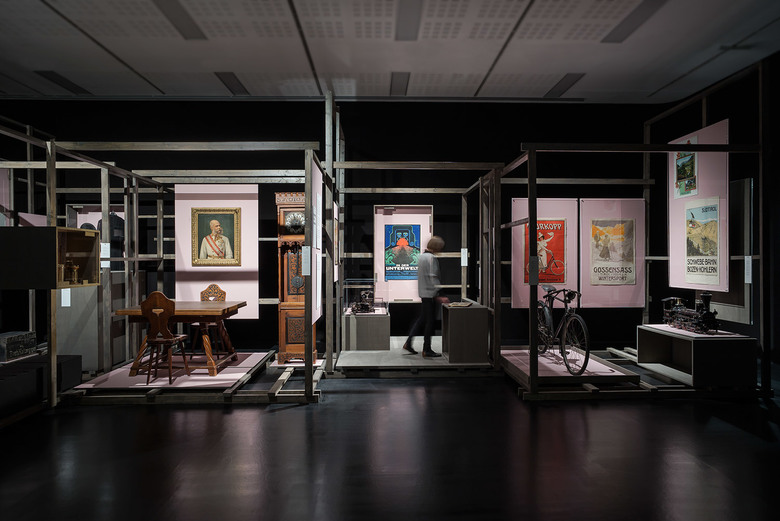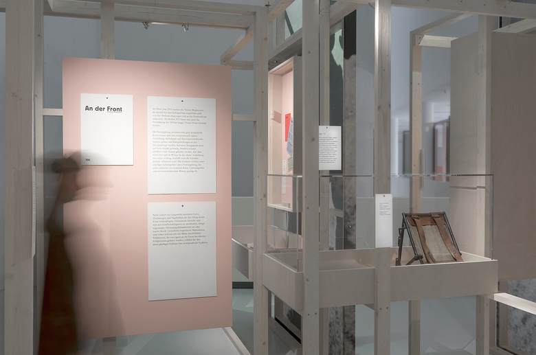 Auftakt der Ausstellung bildet ein Zeitbild Tirol’s im frühen 20.Jh u.a. mit aufstrebendem Tourismus und internationaler Attraktivität. An den insgesamt neun Themenbereichen verändern sich die Szenarien über zwei Ausstellungsebenen hinweg zu heterogenen, verschränkten Raumstrukturen, die den Beginn des Krieges und dessen Auswirkungen thematisieren und spürbar machen.