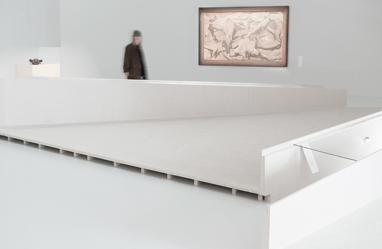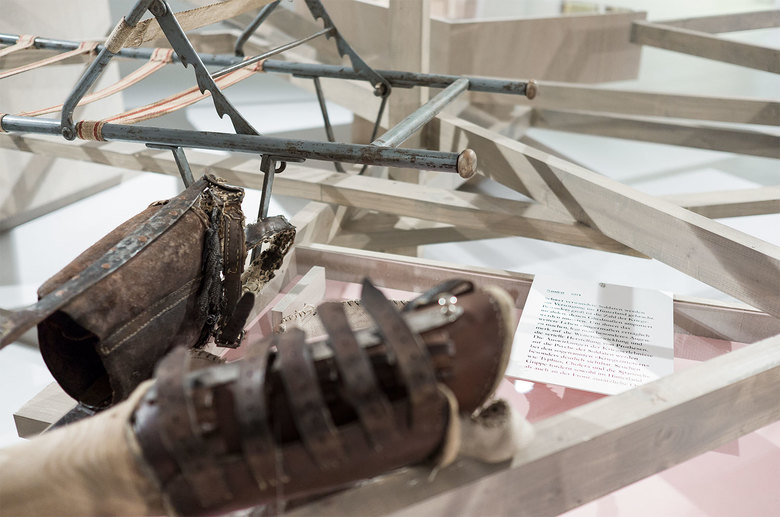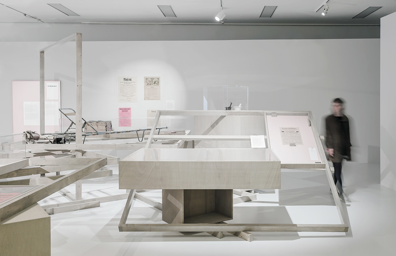 Mit einfachen baulichen Mitteln, gehobelten Kanthölzern und Holztafeln, die in einer geometrischen Systematik nach unterschiedlichen Prinzipien, Ordnung, Reihung, Verdichtung, Überlagerung, Dekonstruktion und Tektonik variieren, korrespondiert die Ausstellungsarchitektur mit den Themenfeldern und Artefakten. Die so entstehenden Szenografien nehmen einerseits Bezug zur fragmentarischen Exponatlage wie auch zu den Fehlstellen der Erzählung und den in der Ausstellung thematisierten menschlichen Katastrophen.