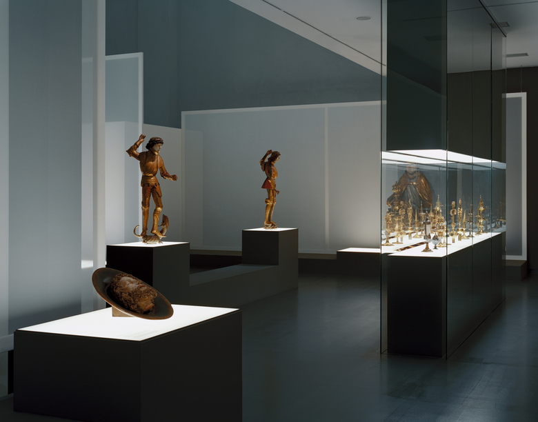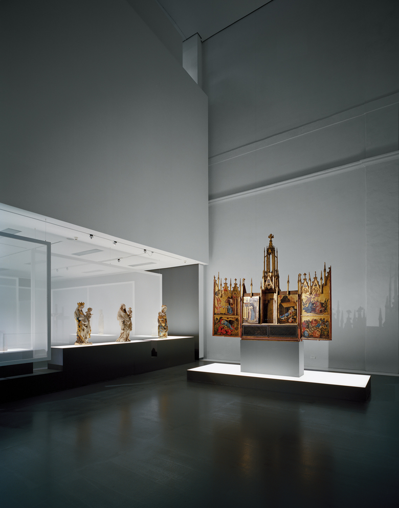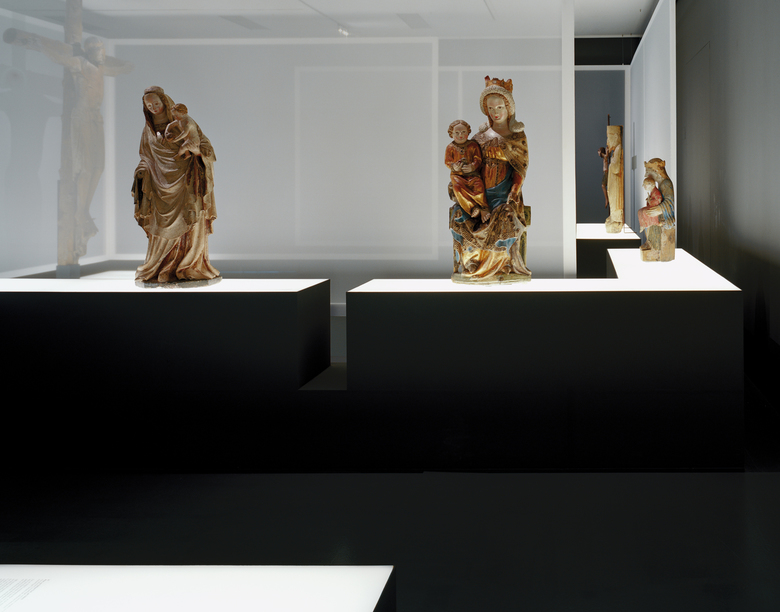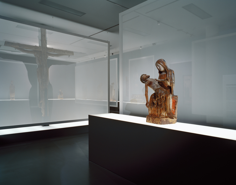 Die Ausstellungsarchitektur folgt dem thematischen Kontext und unterstützt die auratische Wirkung der Kunstwerke. Ddurch Licht und transluzente Stoffflächen entstehen Raumqualitäten für eine kontemplative Rezeption.