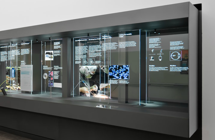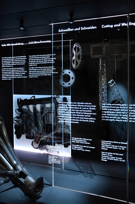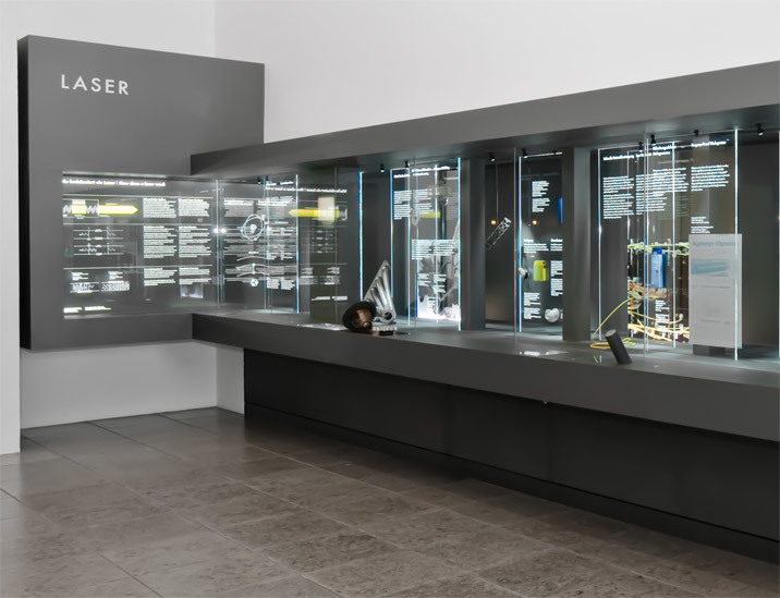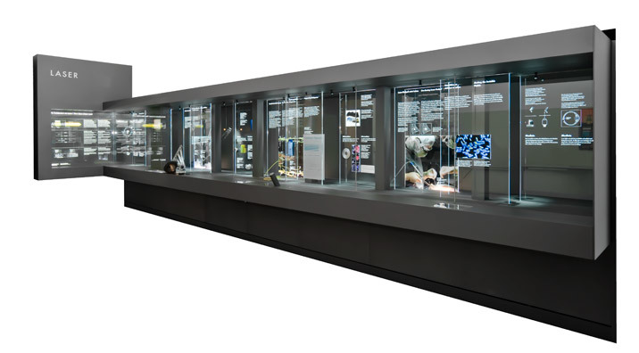 Ausstellungsstation im Deutschen Museum über die Technologie Laser und deren Einsatzgebiete in Technik, Medizin und Kommunikation.