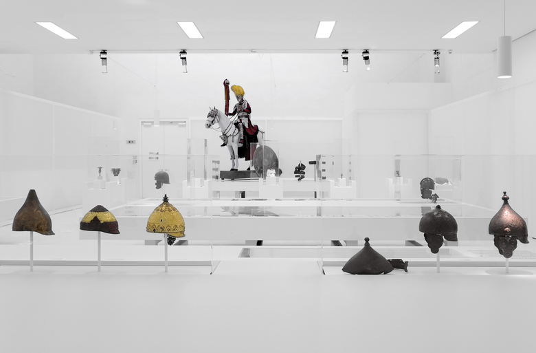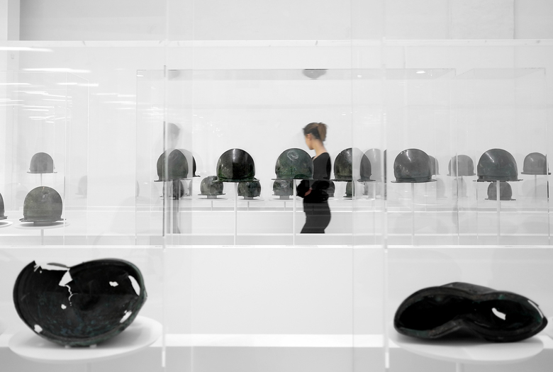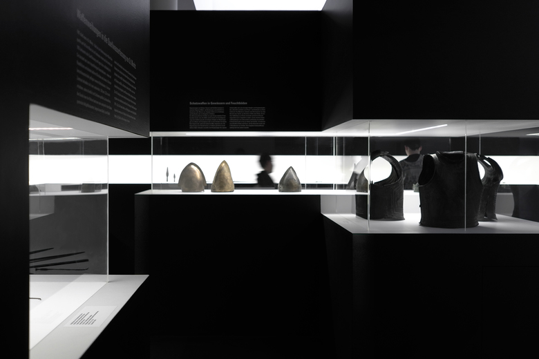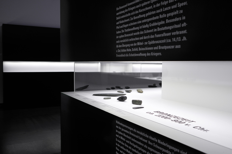 Die Ausstellungsarchitektur transformiert das Thema der geologischen Erdschichtung. Schicht für Schicht dringt der Besucher ein in die einzigartige Sammlung der chronologisch geordneten Waffenopfer aus Stein-, Bronze-, Eisen- und Römerzeit.