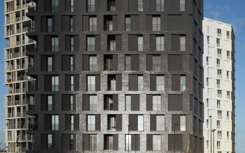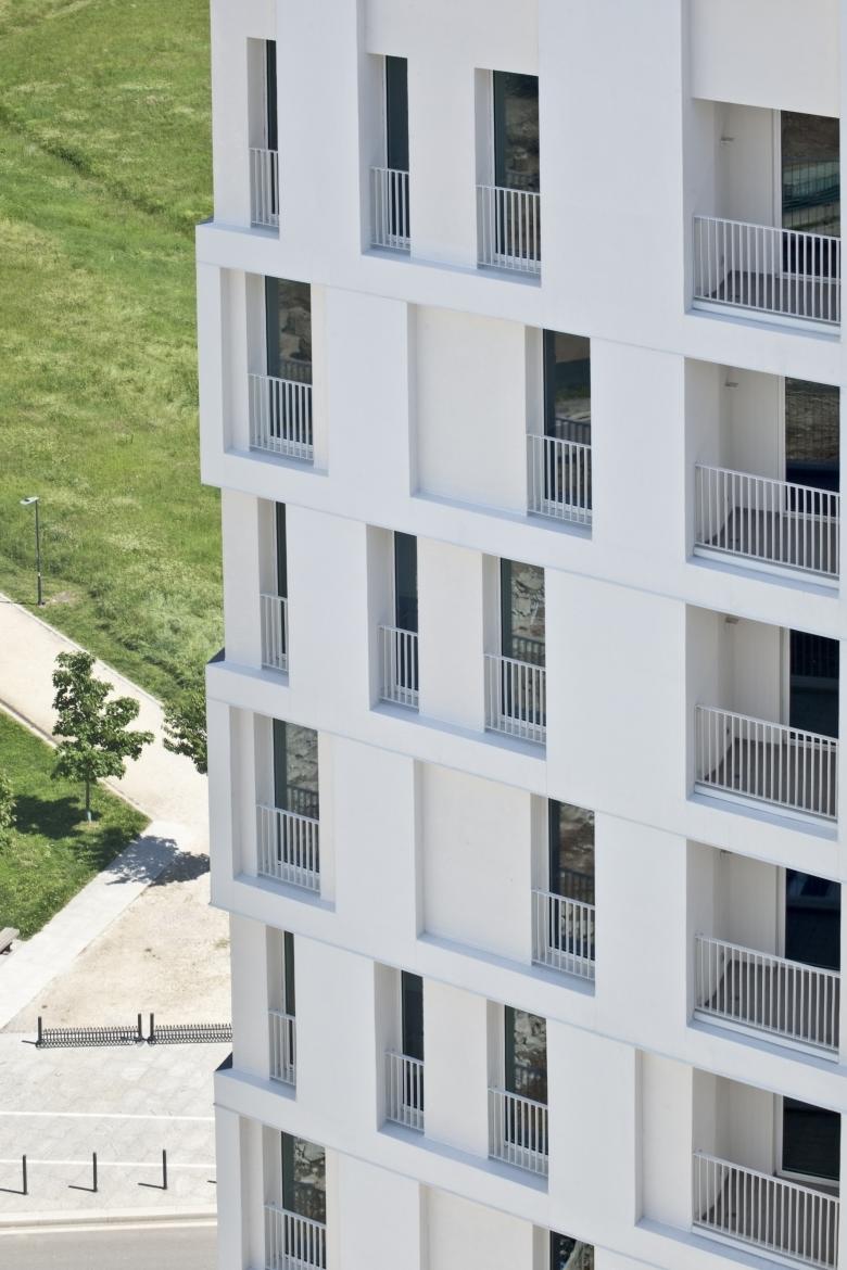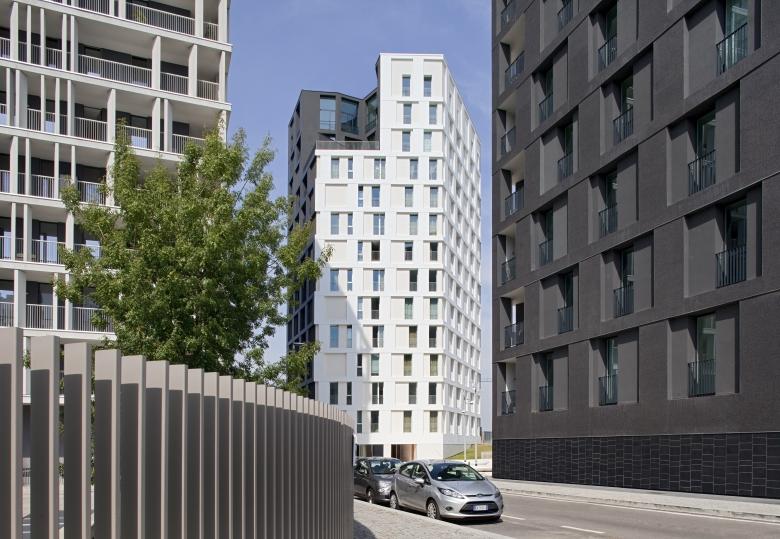 The towers, bent, modeled and oriented to ensure that all the apartments could enjoy the view of the surrounding green, have a different material treatment on the fronts: the elevations, strongly rhythmic, are designed by full-height windows, which are cladded with the same white stone of the square up to the first level, creating a continuity between the horizontal and vertical planes, while on the outside, towards the village, they are finished with a darker coating, chromatically matching the adjacent towers . The darker color of the side fronts helps to underline the strength of the incision of the collective space of the square, which is transformed into the 'door to the park'.
