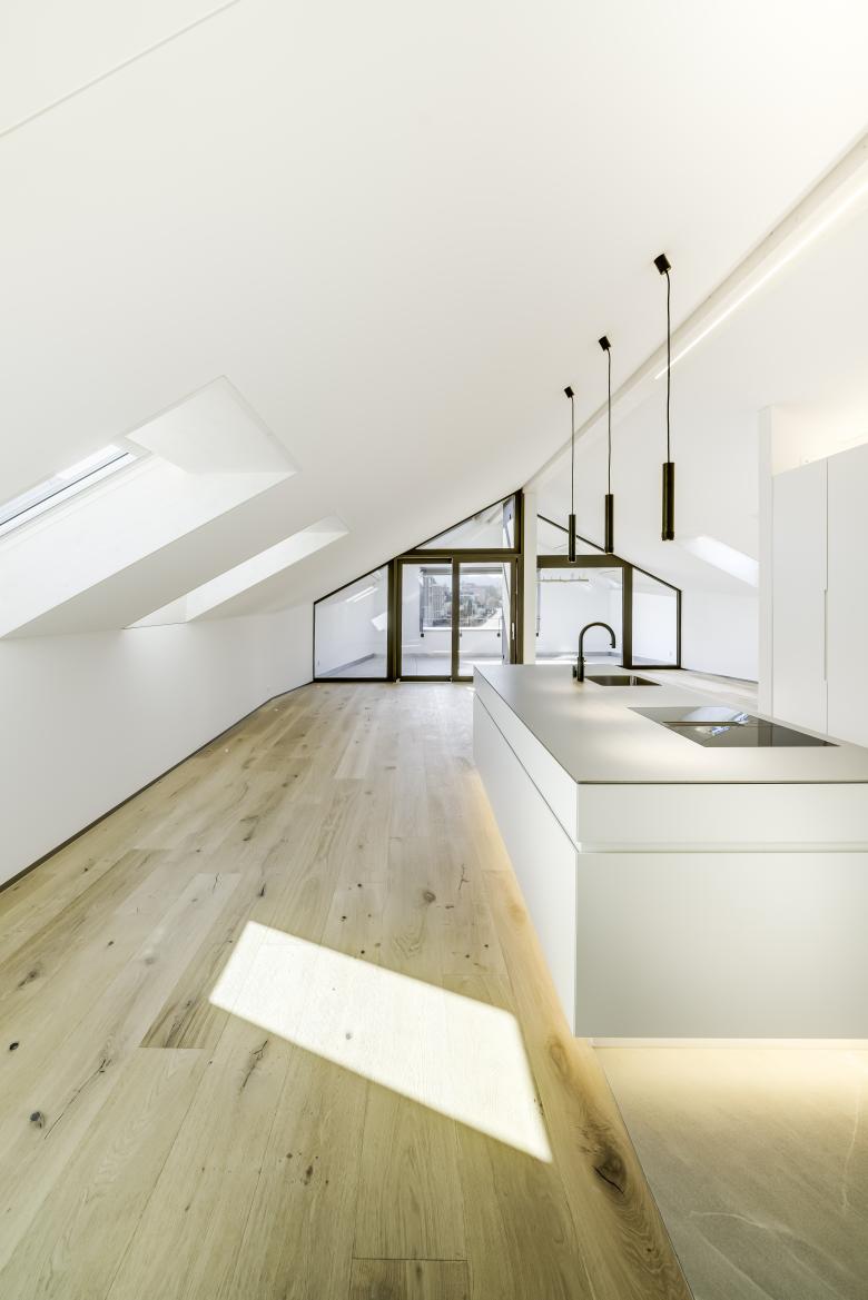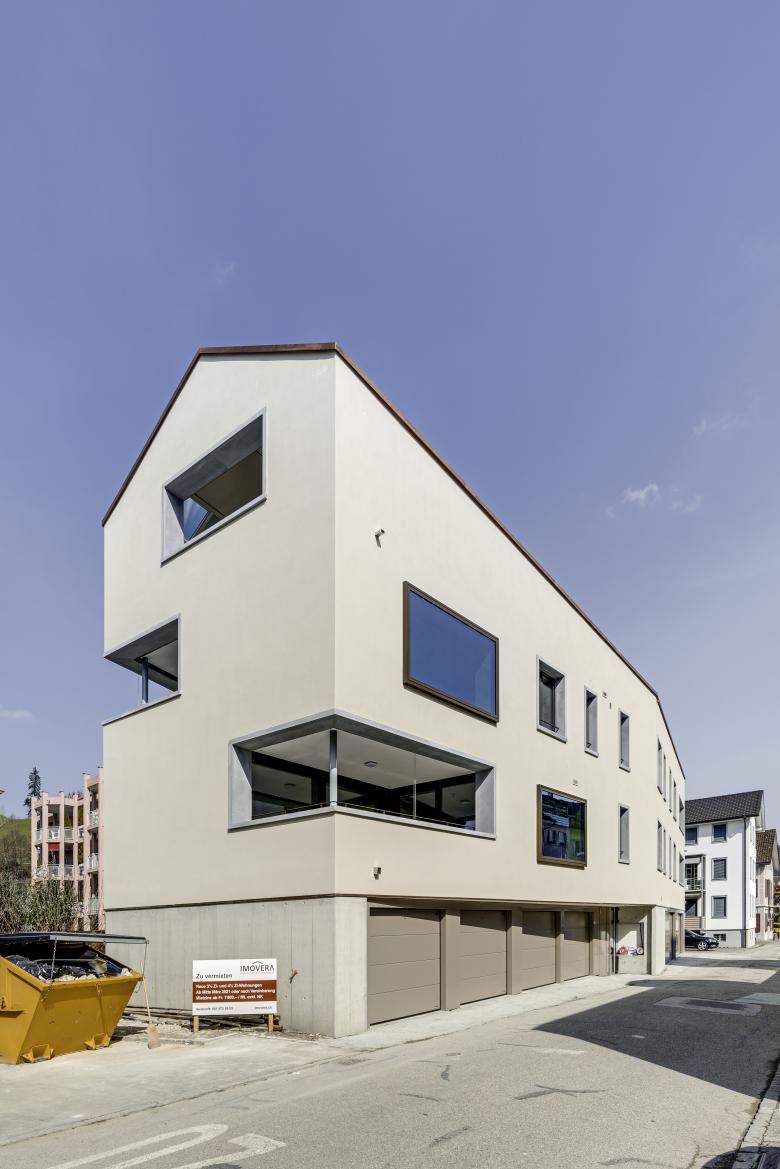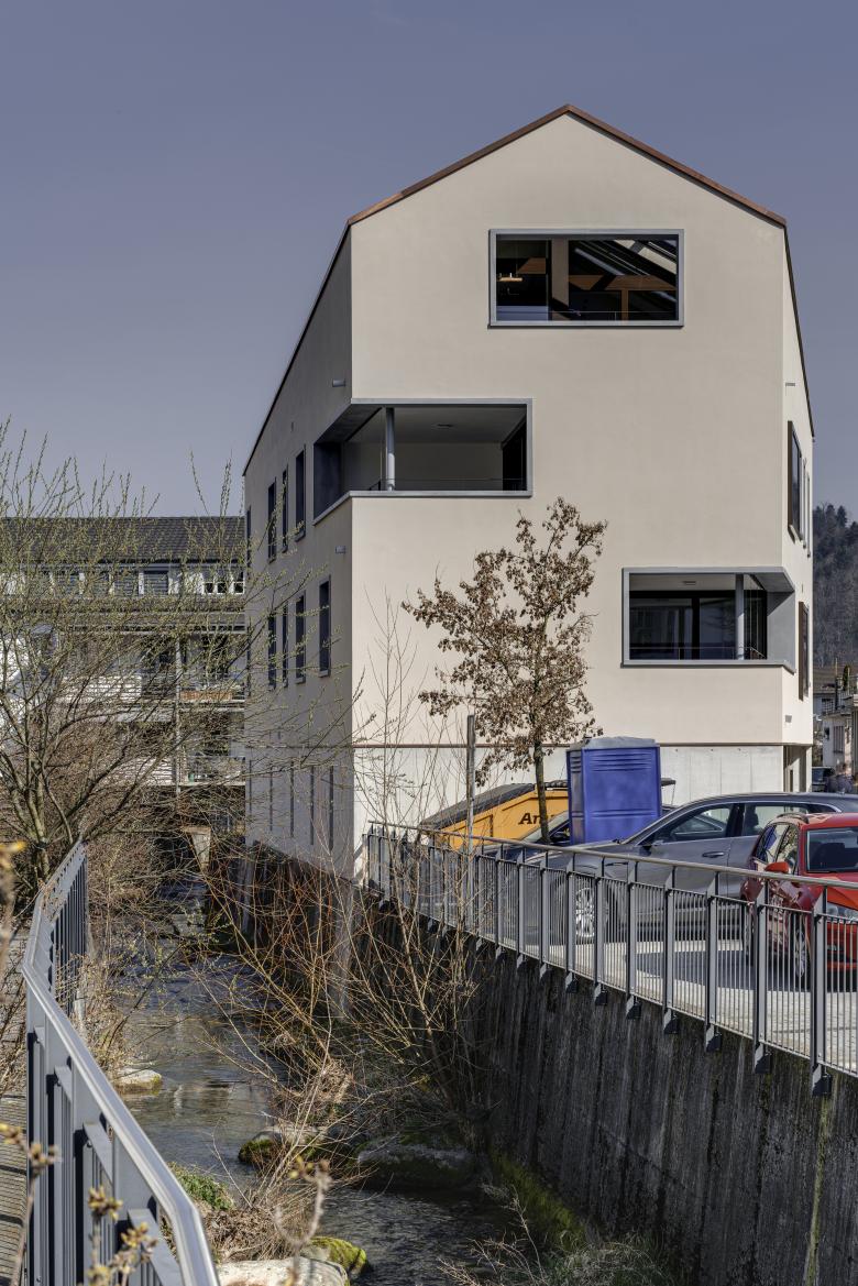 Die Setzung des Baukörpers verleiht dem Ort eine klare Identität. Das Volumen passt sich präzise in den Perimeter ein und orientiert sich in der Grösse an den umliegenden Bauten. In der Länge wird das Gebäude durch das konisch zulaufende Volumen und den dadurch entstehenden Knick in der Fassade beidseitig gegliedert. Mit den daraus resultierenden schmalen Giebelfassaden wirkt das Gebäude optisch kleiner. Mit dem Satteldach wird die intakte Dachlandschaft der Altstadt im äusseren Ortskern sowie der umliegenden historischen Bauten fortgeführt. Durch die konische Gebäudeform entstehen auch unterschiedliche Traufhöhen, ähnlich wie man sie bei den gegenüberliegenden Altstadtbauten mit ihren verschiedenen Höhen findet. Das Spiel mit den Traufhöhen und die schlichte Ausgestaltung des Dachrandes verleihen dem Gebäude eine moderne Formensprache. Die Fassadengestaltung des Neubaus orientiert sich am bestehenden Gebäude und der ortstypischen Bauweise. Die Wohnungen darüber haben eine Lochfassade und Loggias. Das Gebäude am Grabenweg ist im Sinn einer nachhaltigen Bauweise als monolitisches Einsteinmauerwerk konstruiert.
