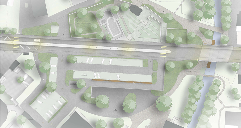 Eine Parkplatzanlage mit einem vorgelagerten kleinen Park/Wald unterstreicht die Bedeutung des Ortes und vermittelt eine klare Identifikation. Sitzbänke unterstützen den Charakter der Begegnungszone.