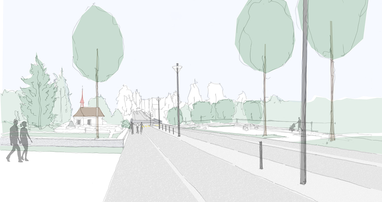 Die Erschliessung erfolgt über den Fuss- und Veloweg, ausgehend von den Begegnungszonen Friedhof und Schulhaus. Die Sure und die historische Römerbrücke rücken ins Blickfeld, werden erlebbar. Das Gebiet wird zum Naherholungsraum, der das Erlebnis Fluss als Einzigartigkeit zum Zentrum hat. Den Naturcharakter unterstreichende Kieswege führen durch das Gebiet, Bänke dienen als Sitzmöglichkeiten und Ruheoasen.